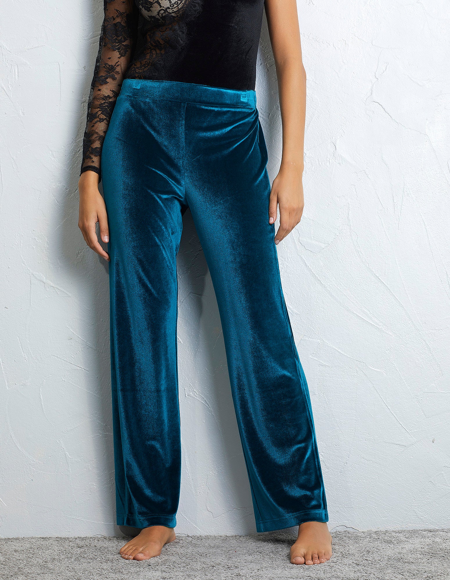 Pants in soft and warm velvet. Wide cut that falls gently on the body. Comfortable and practical elastic waistband. Regular fit. Two elegant color tones: lagoon blue and black.