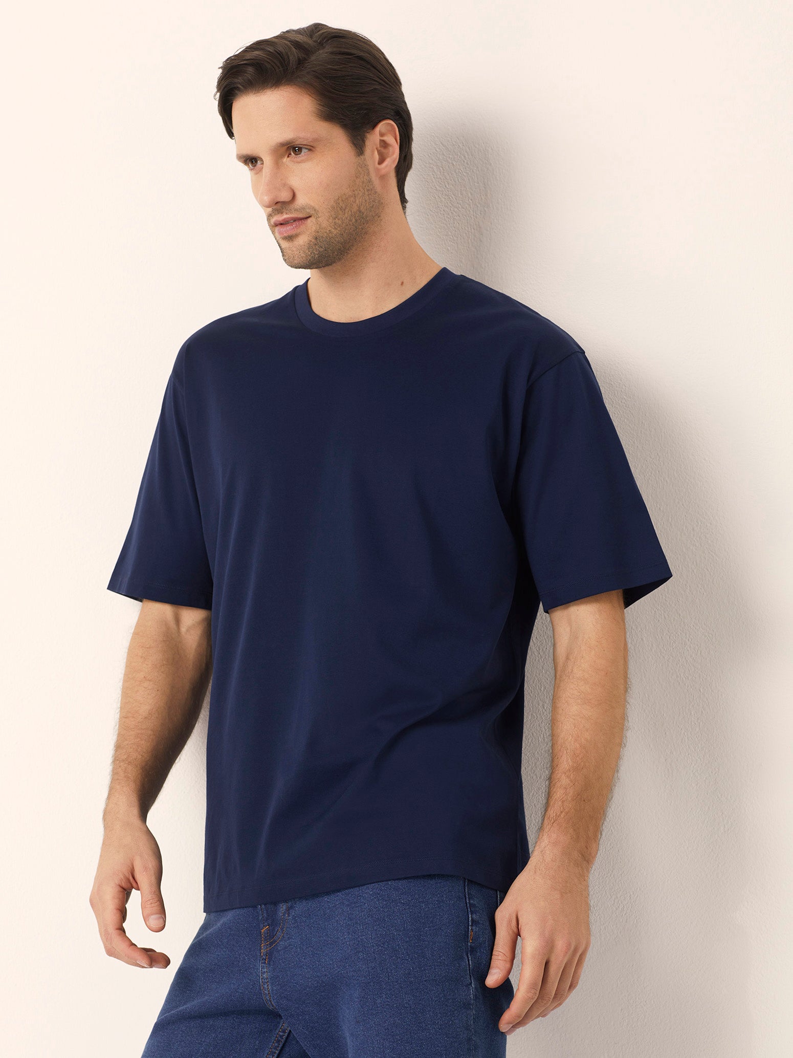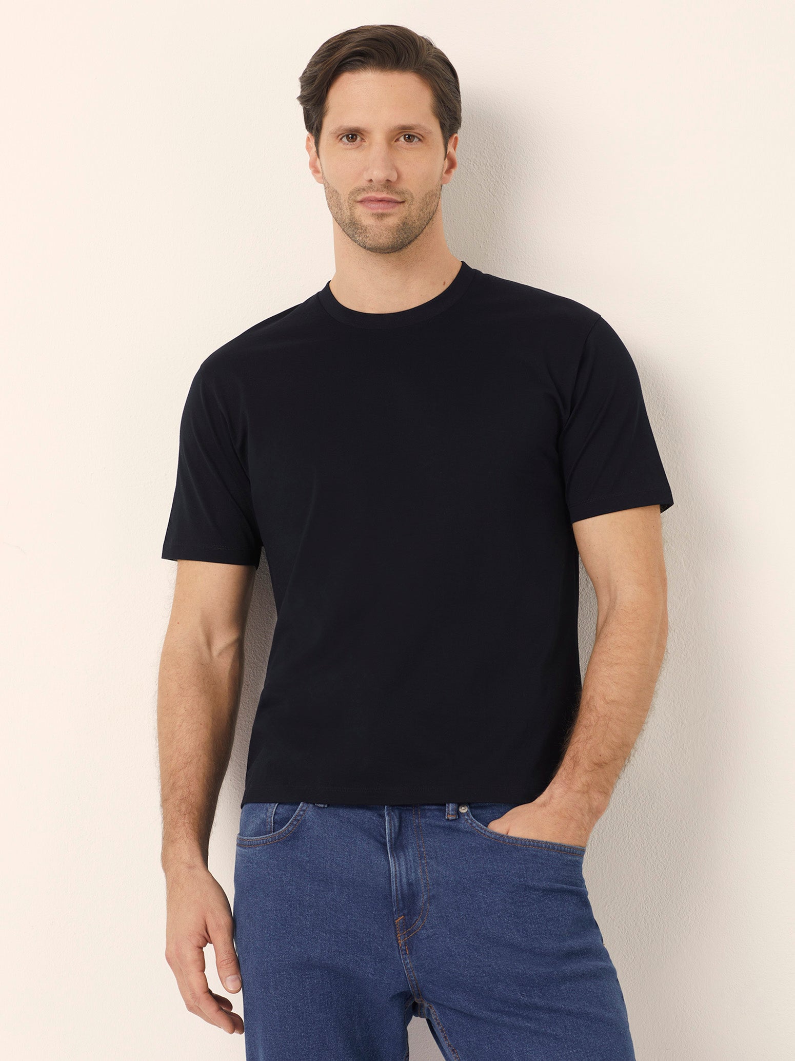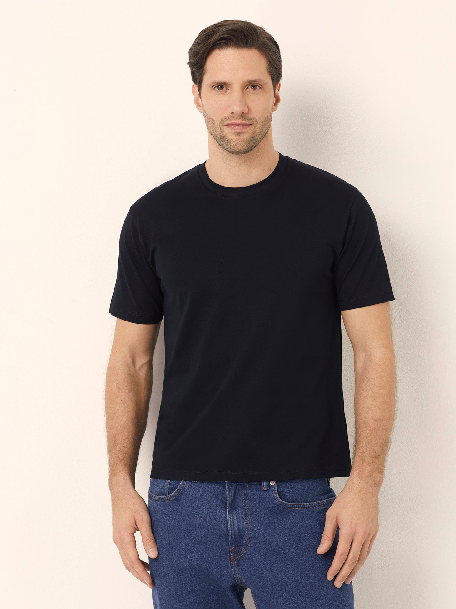 Men's Premium Cotton T-shirt in cotton jersey, crew-neck model. Solid color, available in three classic shades: black, blue, and white, with a regular fit