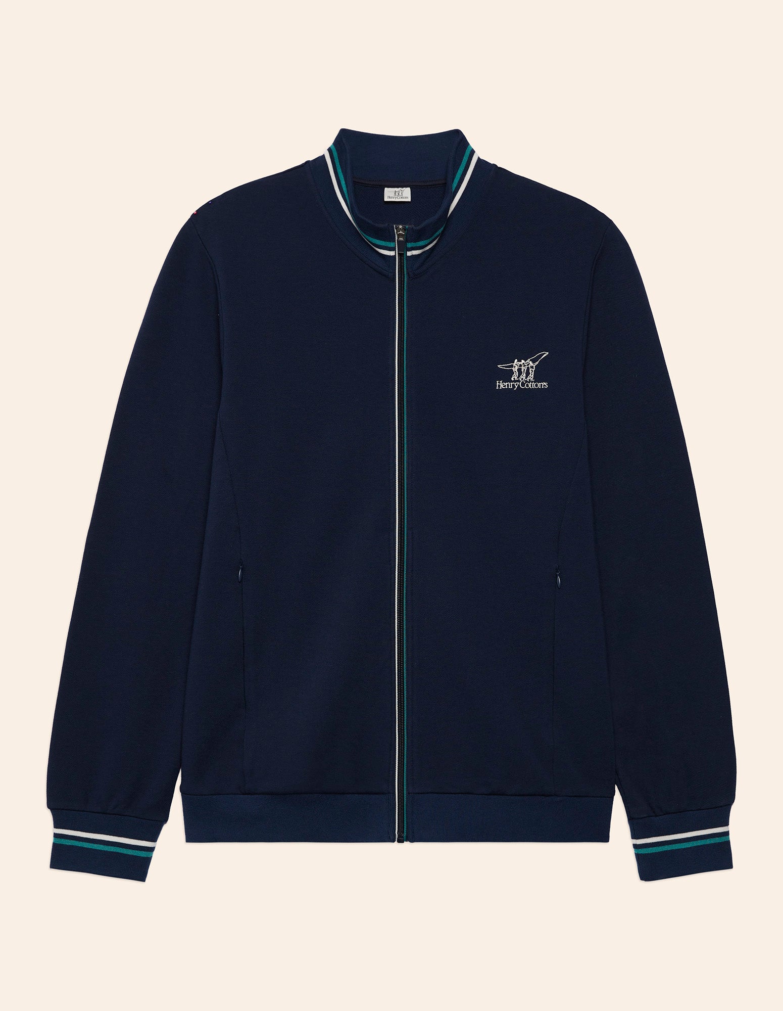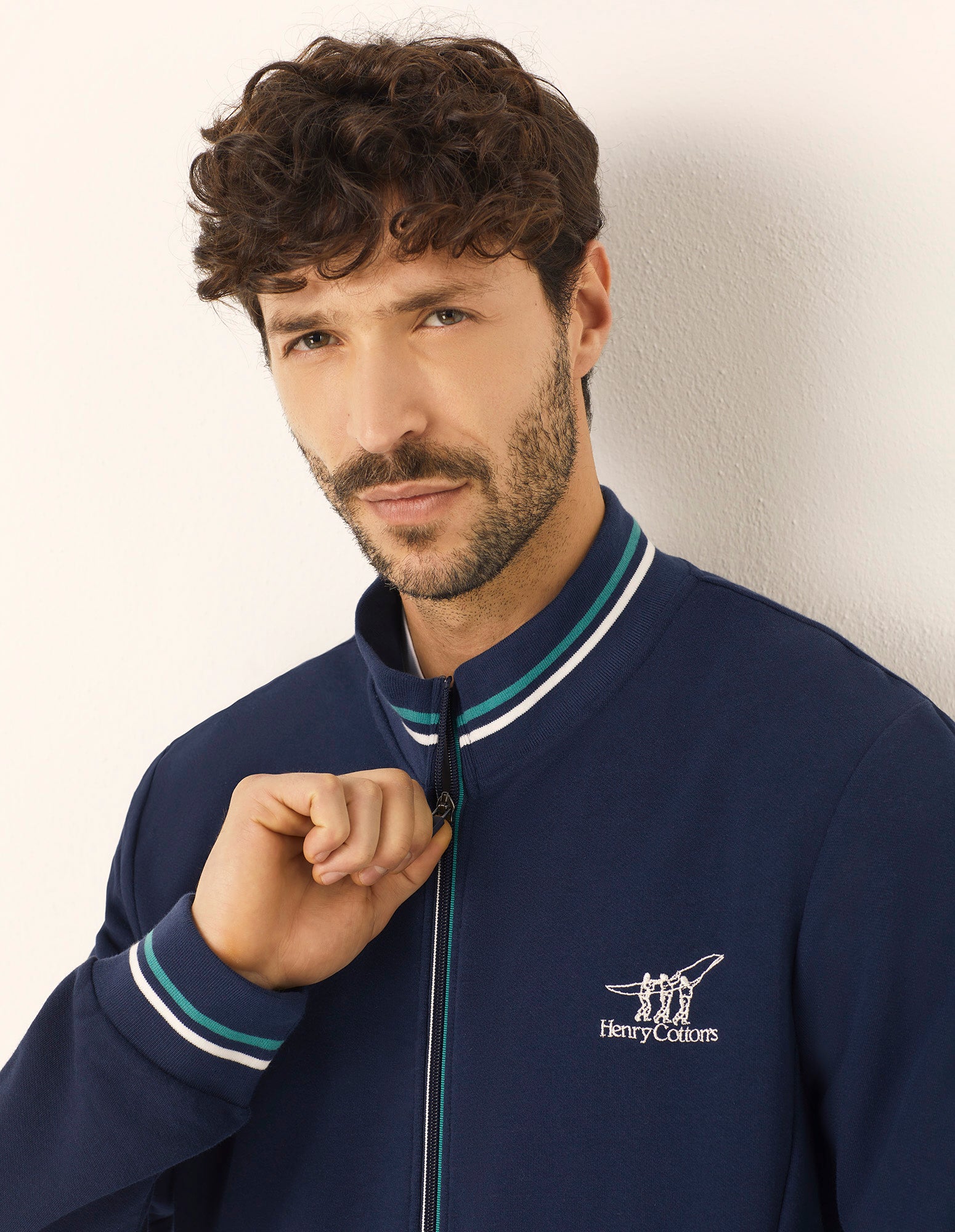 Men's sweatshirt in stretch cotton and Modal from the new Henry Cotton’s x Yamamay collection. Dark blue, with a front zip and zippered pockets, it combines comfort and dynamic style. High collar, ribbed cuffs and hem with a fine striped pattern in aquamarine, blue, and white. Perfect for leisure and travel, it pairs perfectly with classic knitwear and matching socks.