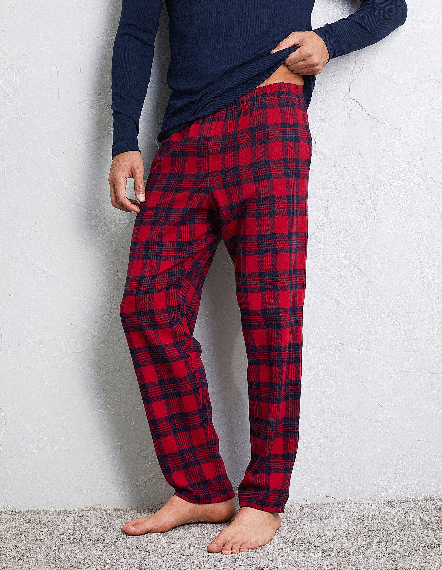 Long trousers in delicate flannel yarn dyed. Fitted with a practical drawstring at the waist. Two large side pockets. Check print with elegant shades of red and blue. Classic cut and comfortable fit. Ideal for winter nights.