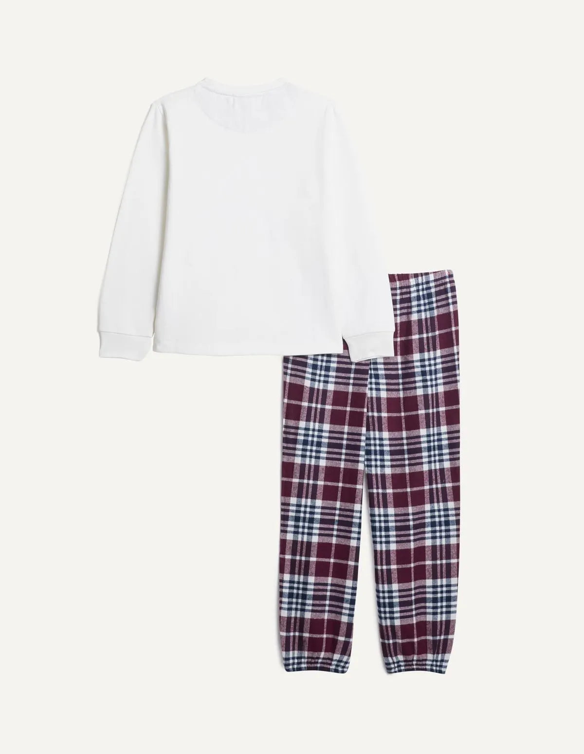 Long pajama for girls in warm and soft brushed fleece. White crew neck shirt with cuffs on the sleeves and a cute print. Plaid print pants with elastic at the waist and ankles. Comfortable and regular fit. Perfect for creating matching sets with the whole family.