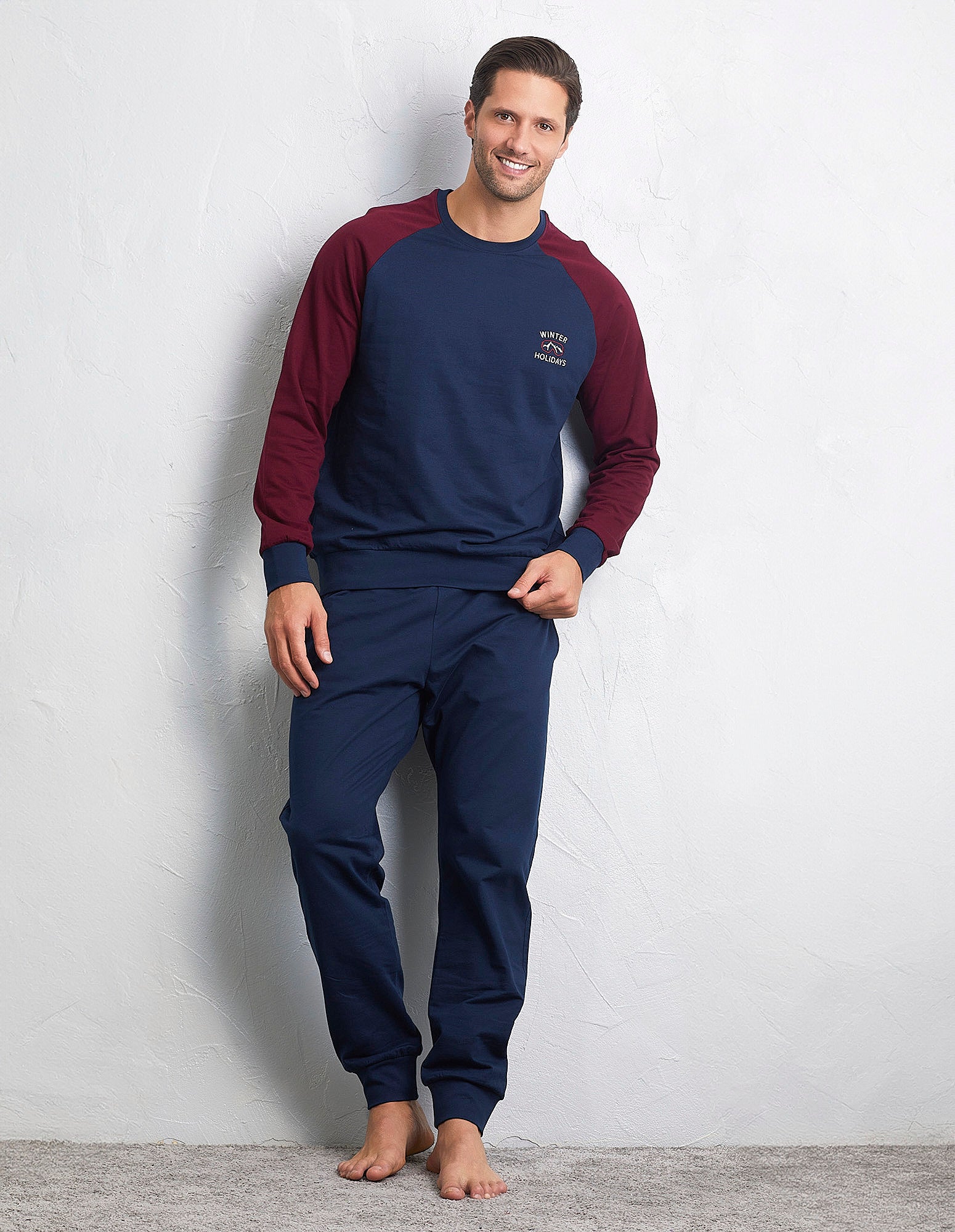 Long pajamas in soft and delicate cotton. Elegant midnight blue color with burgundy details. Crew neck shirt with cuffs on the sleeves. Pants with a drawstring waist, elastic cuffs, and large side pockets.