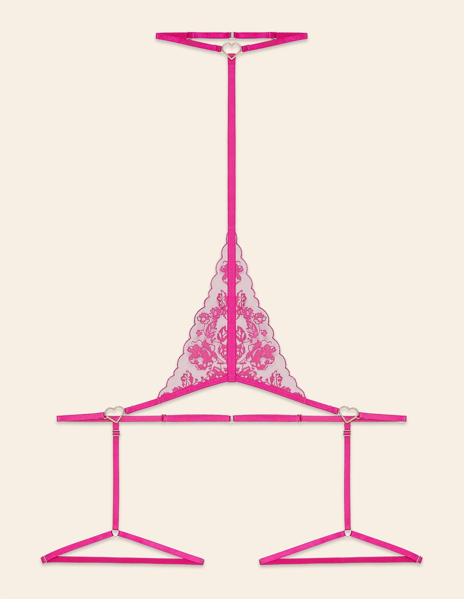 Secret heart Woman Choker, a super sexy, minimal yet provocative accessory. Hot pink choker-style collar with small metal heart-shaped details at the neck and hips. Adjustable elastic at the neck, along the torso, around the hips, and thighs, with embroidered lace above the navel. One size, a bold addition to any lingerie set.