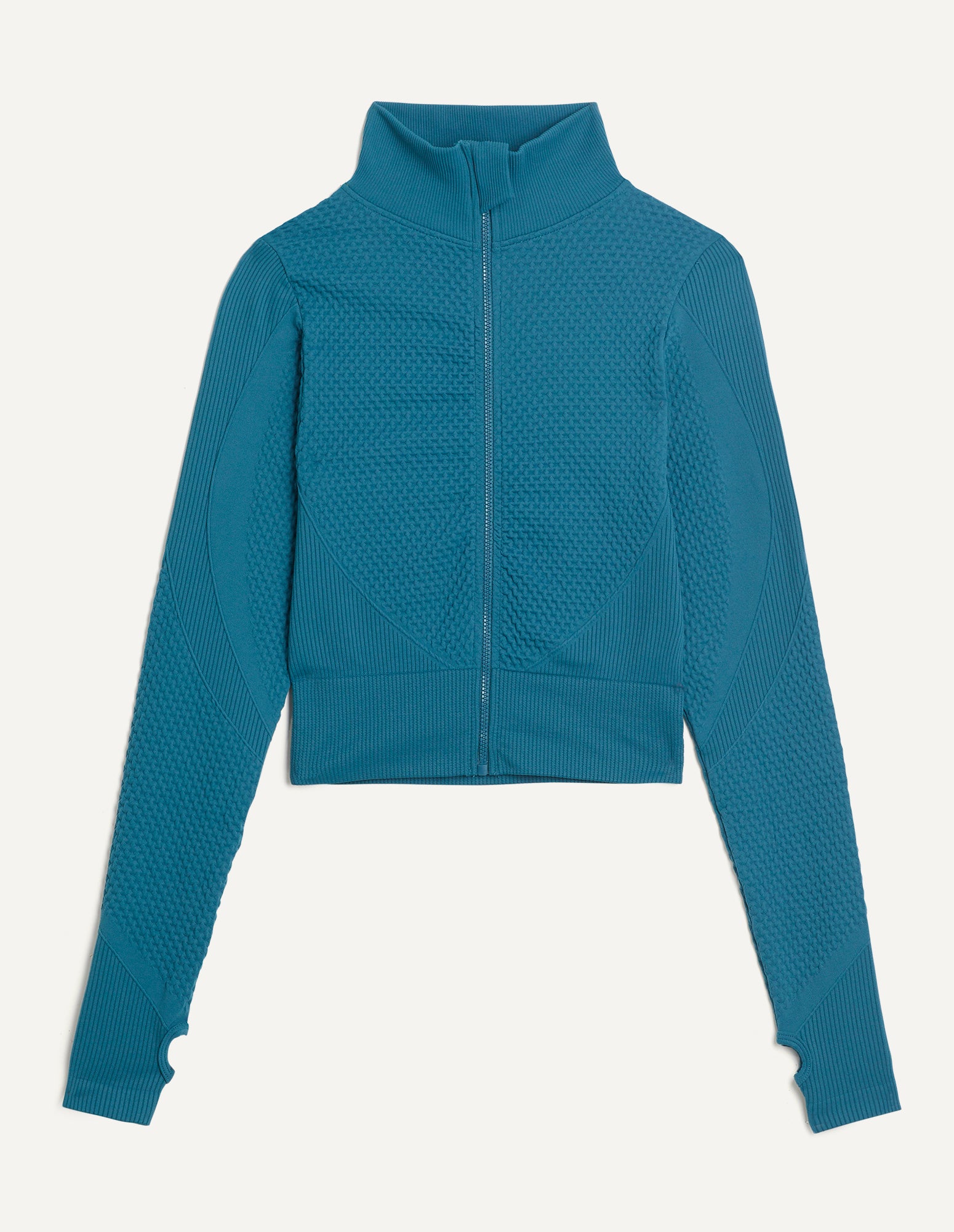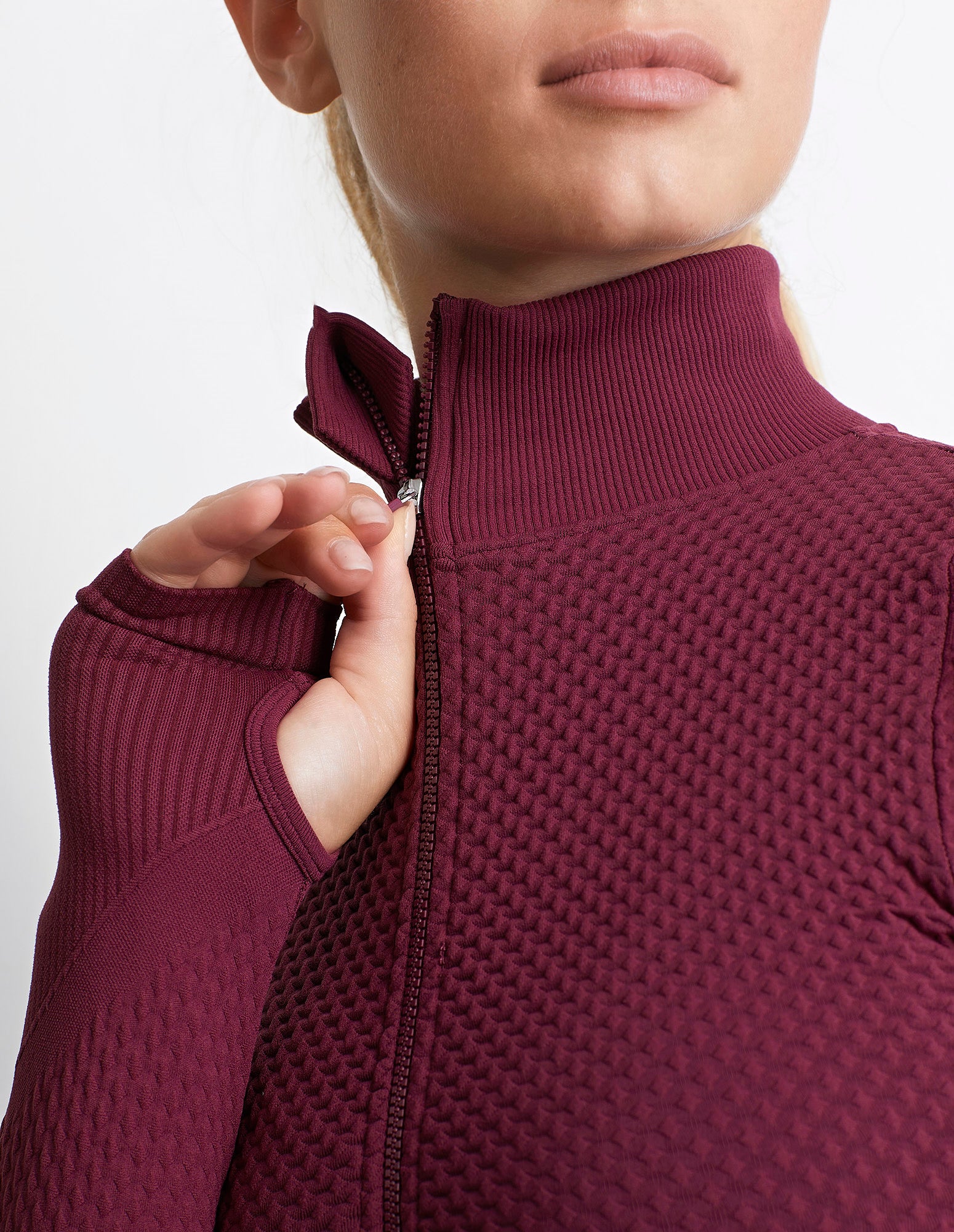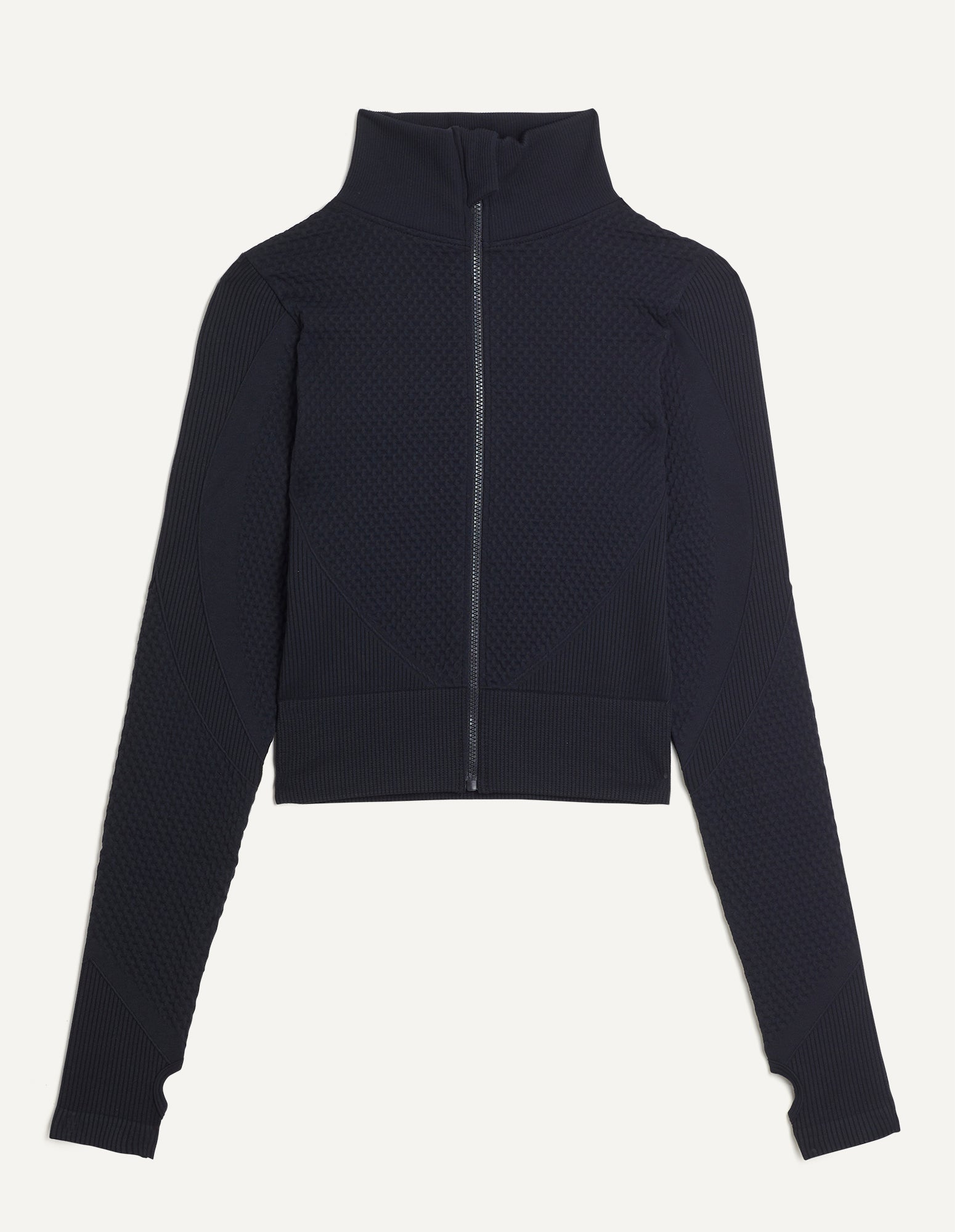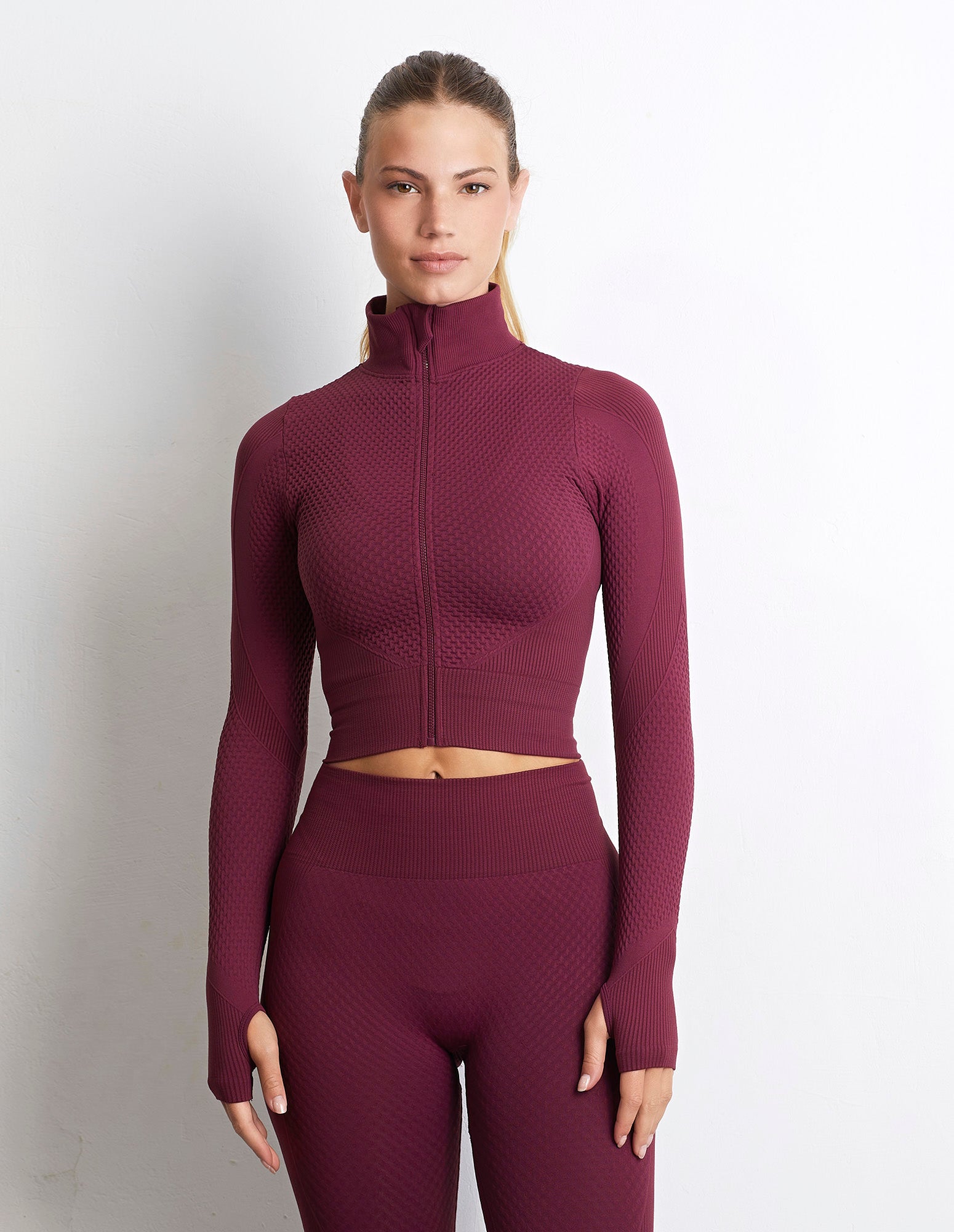 The Seamless Yoga sports line features sophisticated models with a minimalist and monochrome design, available in black, burgundy and lake green. A selection of essential items perfect for your fitness routine, ideal for both yoga practice and leisure. Made of a soft textured technical fabric, they take advantage of seamless technology and an antibacterial treatment, ensuring freshness even during the most intense workouts. This short jacket with high neck and long sleeves perfectly combines practicality and style thanks to the comfortable front zipper. The strategic opening on the cuffs, which allows you to insert your thumb, ensures greater mobility during training. Combine it with the top and leggings from the same collection for an inimitable look!