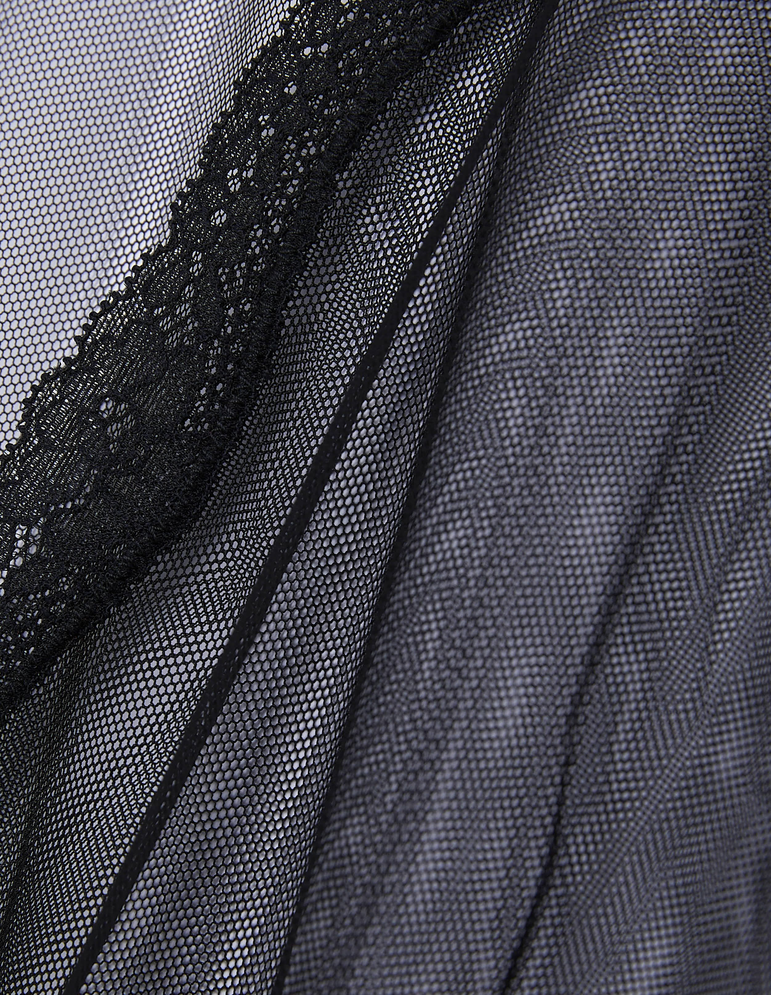 Amelie sensual short kimono in sheer net with lace trim along the opening and sleeves, made with recycled fibers. Microfiber belt closure and gathered waist. One size, ideal for every body type.