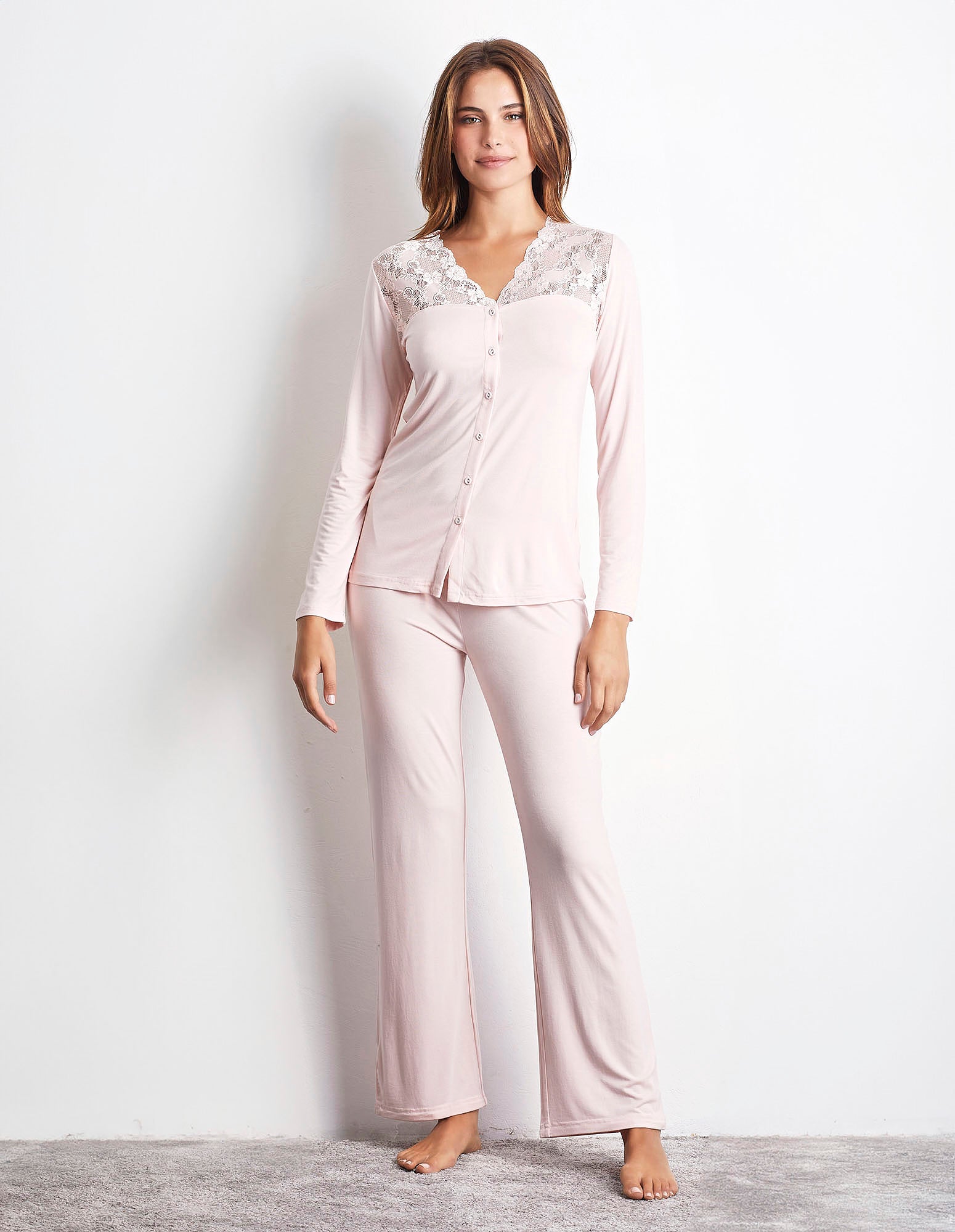 With Primula Color you always ensure underwear and lingerie class, refined and elegant, that will enhance the beauty of every woman, with details in precious lace and a soft and comfortable fit. Discover this long pyjama for women available in two trendy shades. Soft and delicate, this open long pajamas with buttons in stretch jersey and lace texture on the shoulders will be a caress during your sleep. In addition, the long trousers with elastic waist ensures comfort and adds a touch of comfort and practicality.
