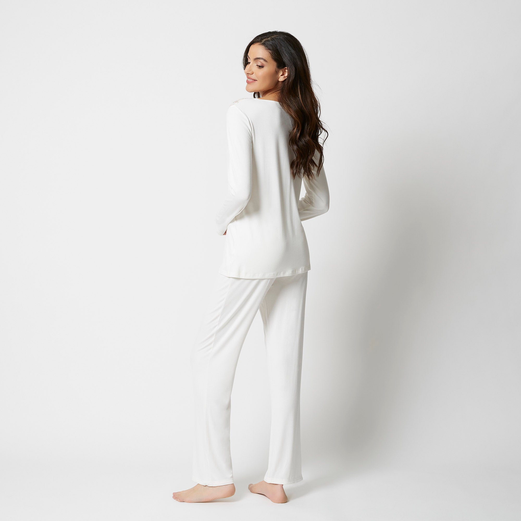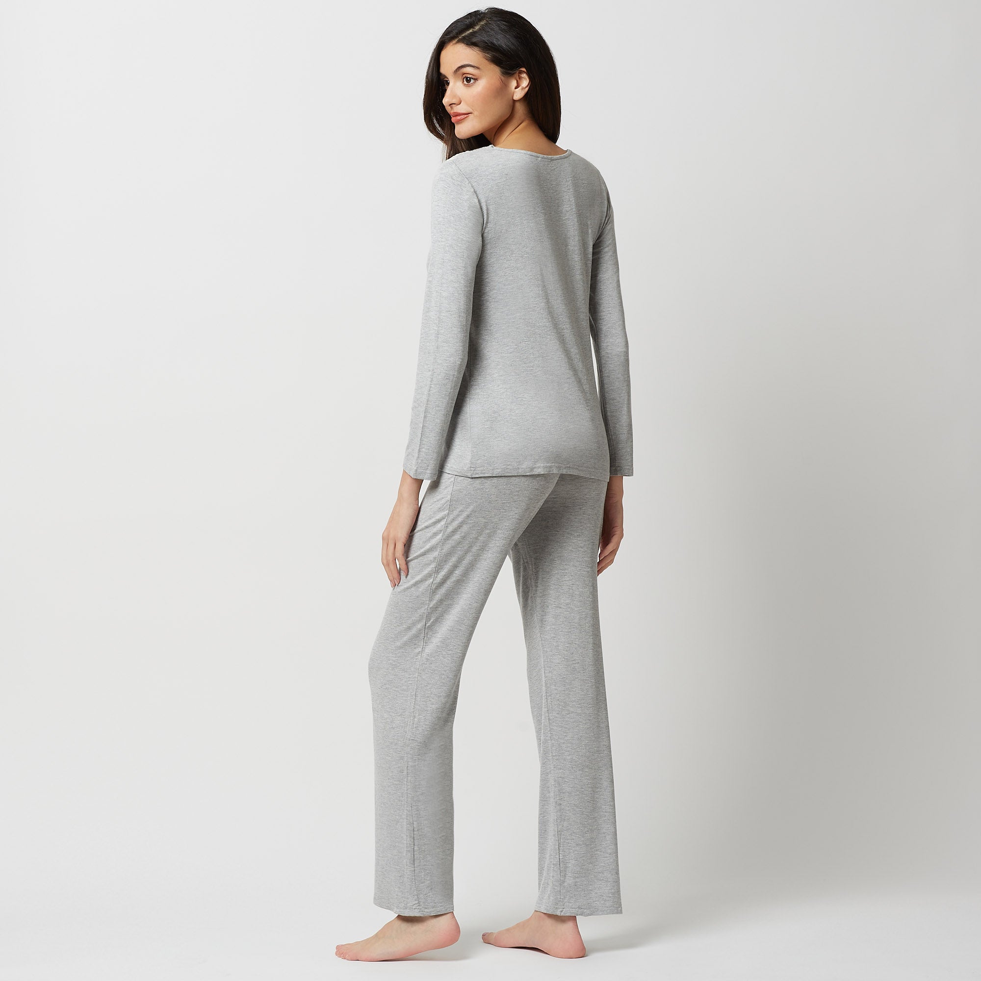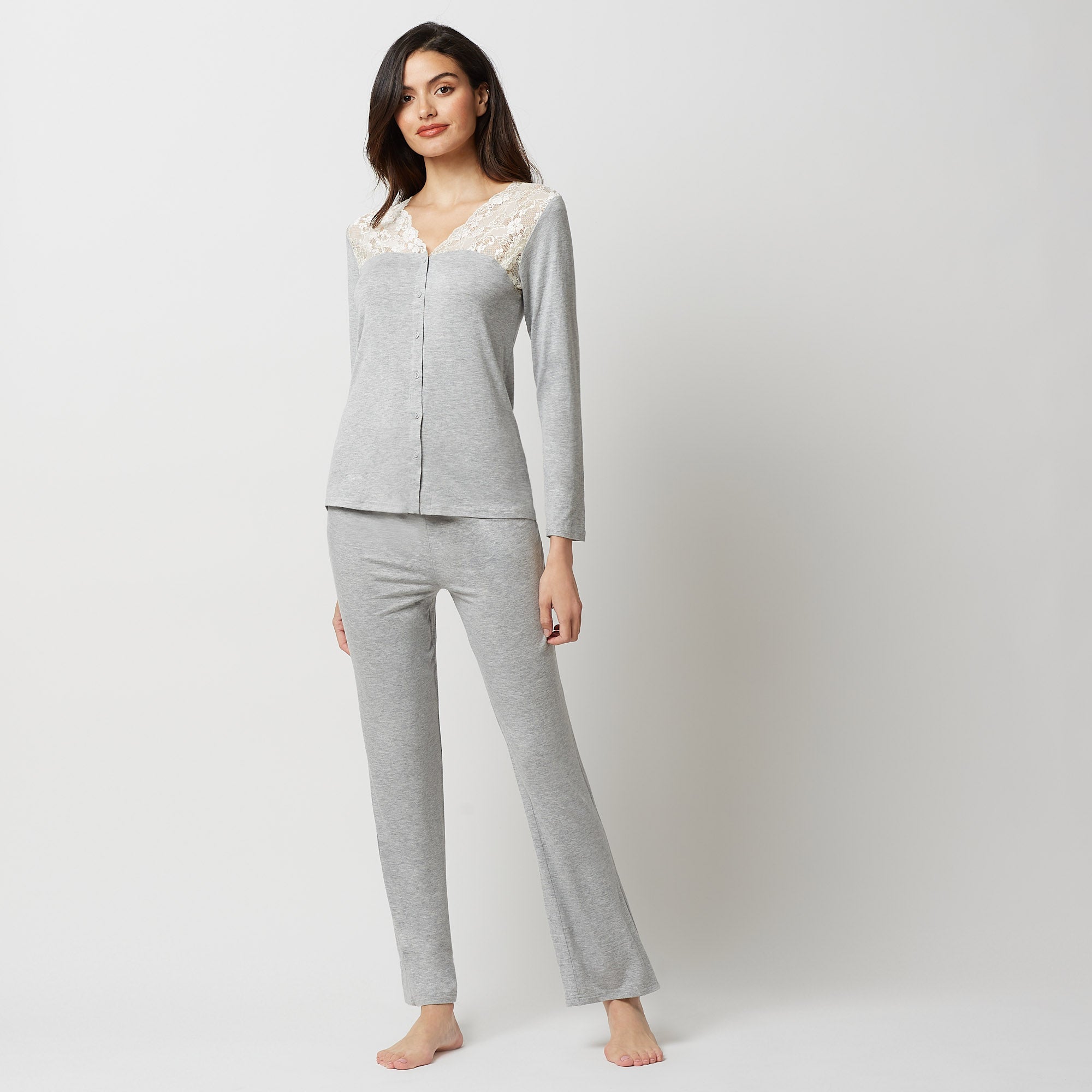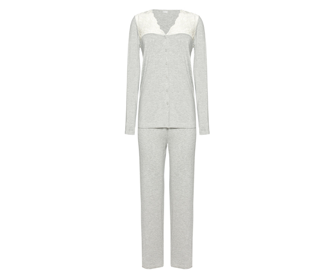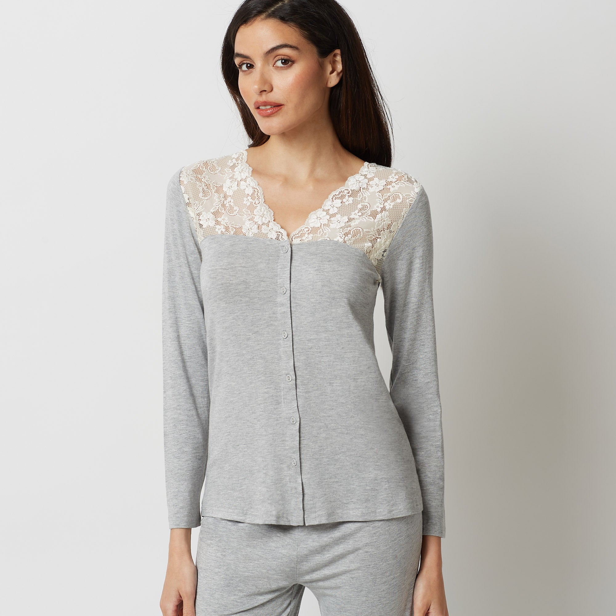 the most comfortable cotton combines with soft lace in this gorgeous pajama top, with a grey and versatile color tone designed to enhance your femininity in a classic primula style.