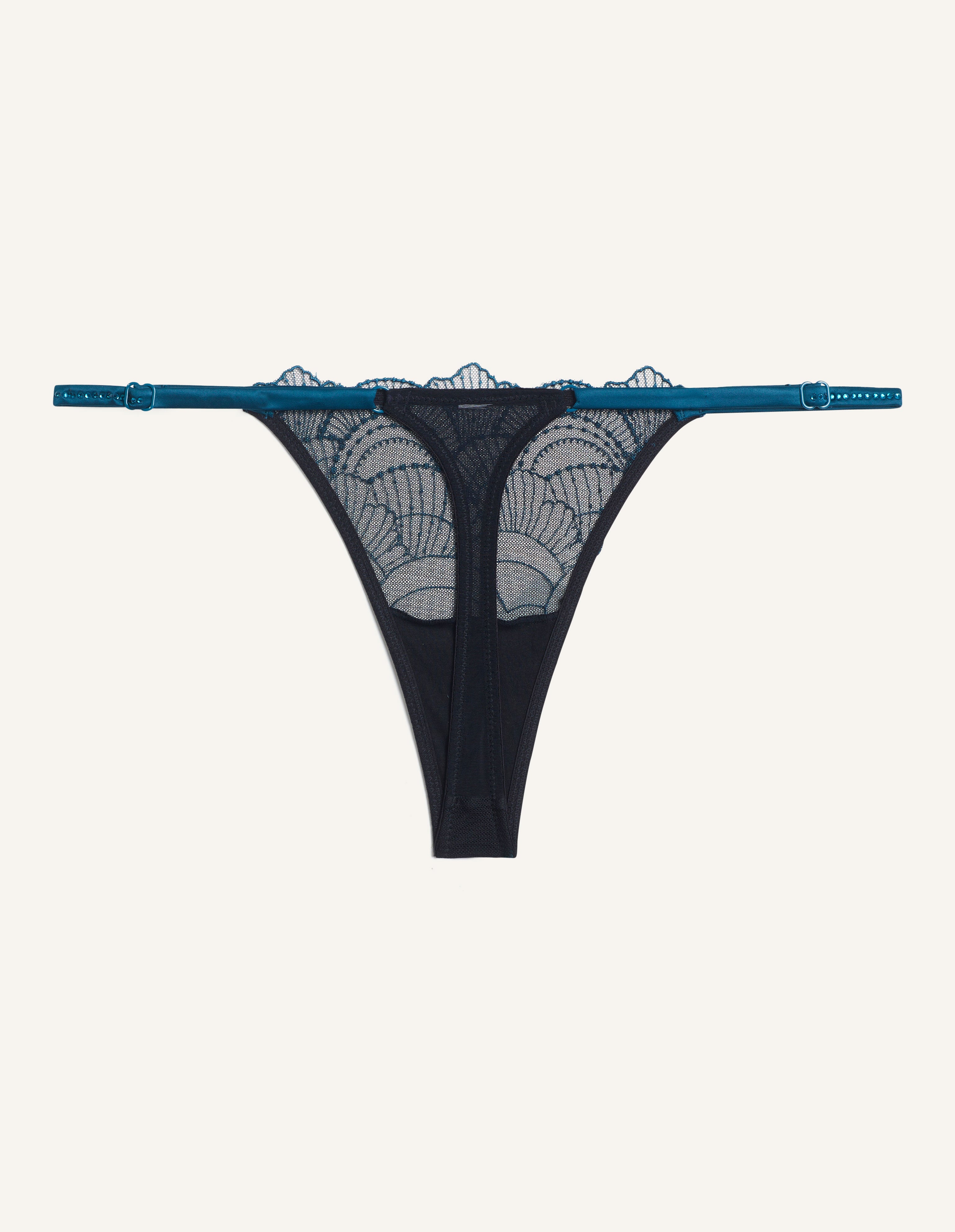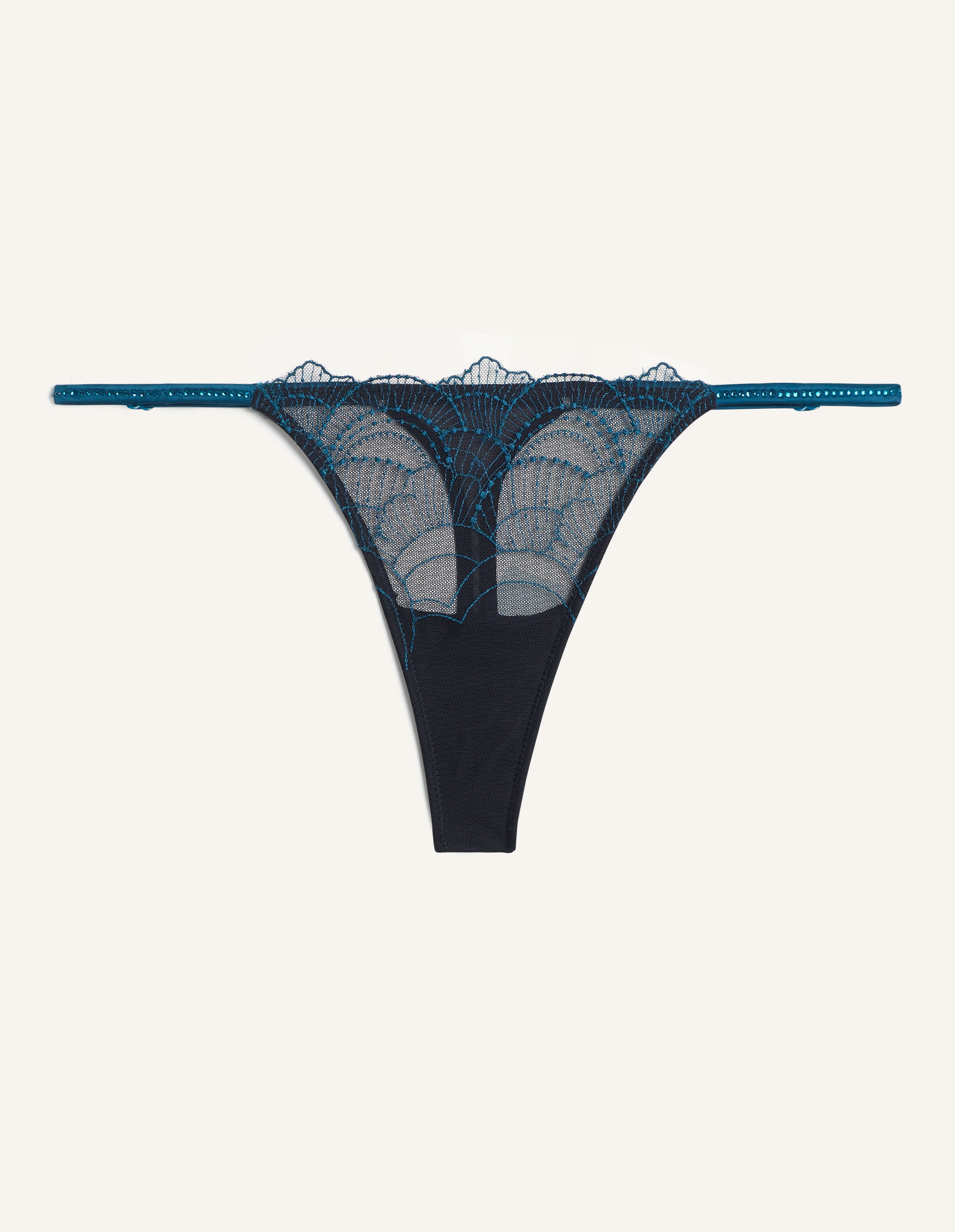 Discover the Emerald Touch line, where luxury meets sensuality. Characterized by its beautiful lagoon blue color, it is a true masterpiece of elegance. Each piece is embellished with delicate embroidered details or sparkling rhinestones, creating a breathtaking visual effect. Perfect for those who want to feel unique and sophisticated. This thong represents the perfect union between comfort and style, a concentrate of femininity and seduction. Made of recycled satin and embellished with recycled and embroidered tulle. Pair it with one of the bras from the same series for a glamorous underwear outfit!