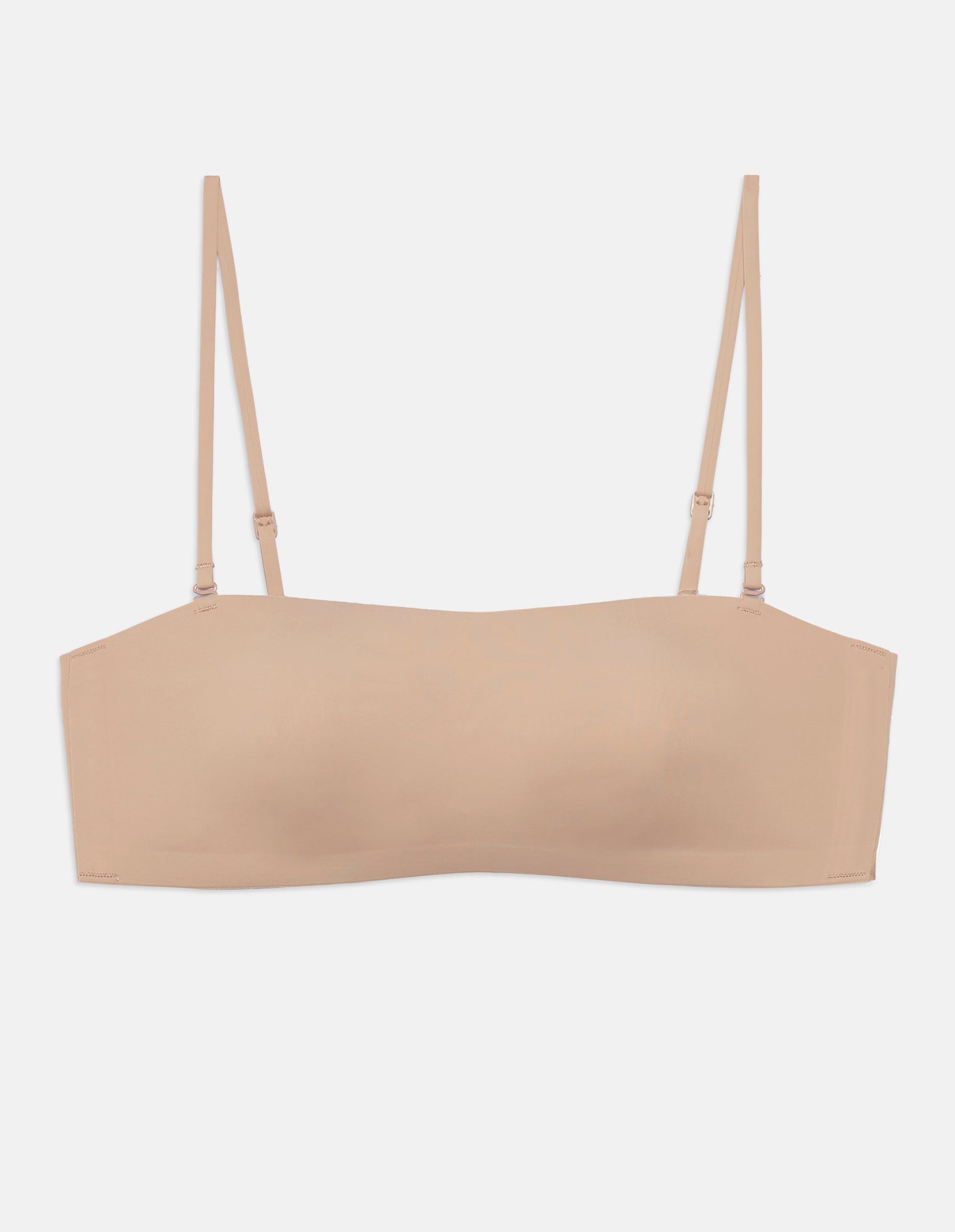 Superfine Shaping, a light shaping line made of comfortable fabric, without constraints. Garments made with recycled fibers, finished with laser-cut edges, seamless and elastic-free, with adhesive Bonding technology. The effect is invisible under any outfit. Shaping bandeau bra with a cut for inserting cups, available separately, and with removable and crossable straps. For greater stability, strategic reinforcements with a slight relief and rigid lateral supports.