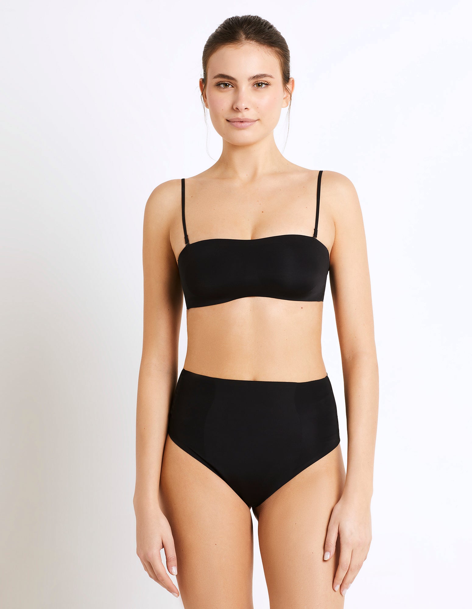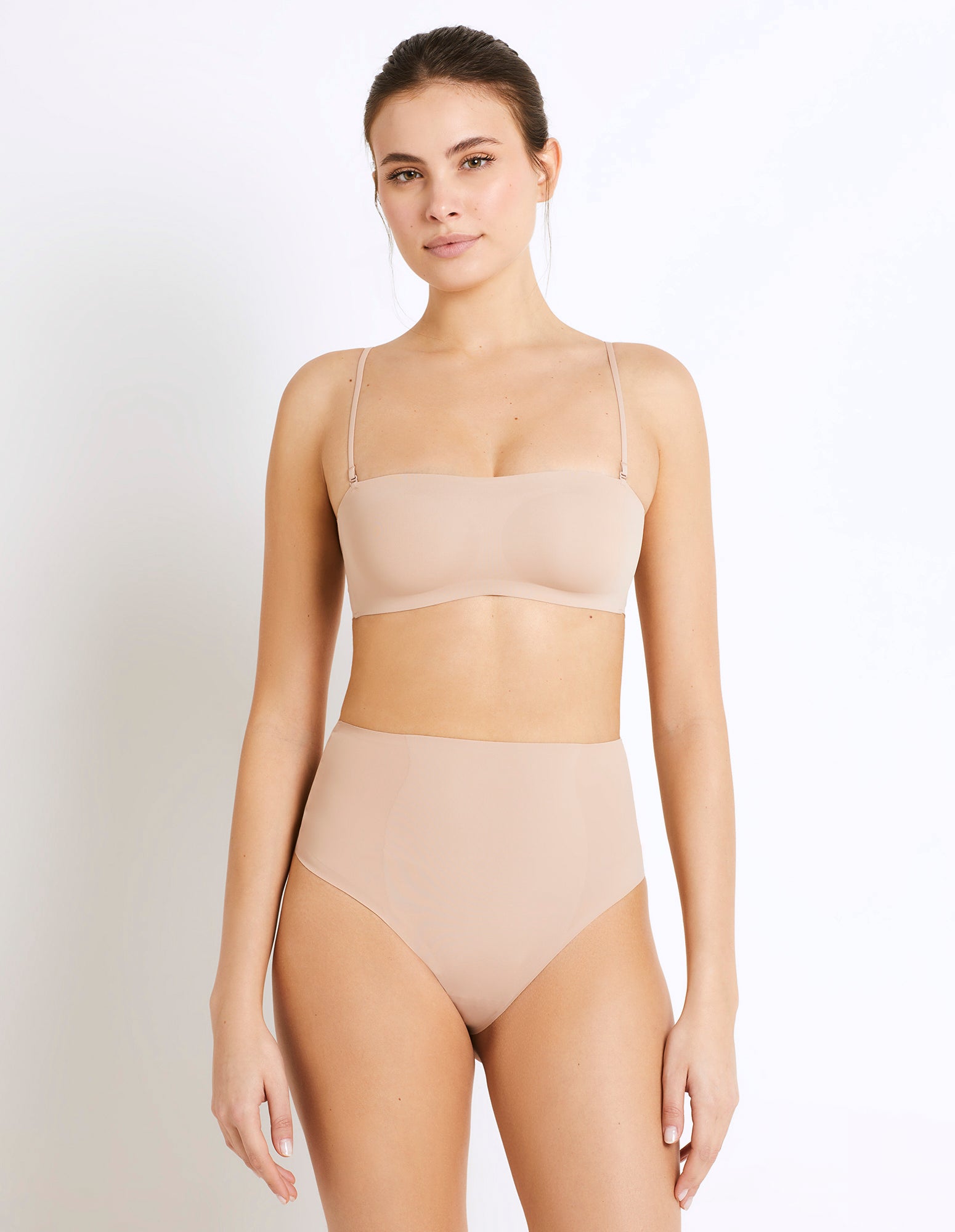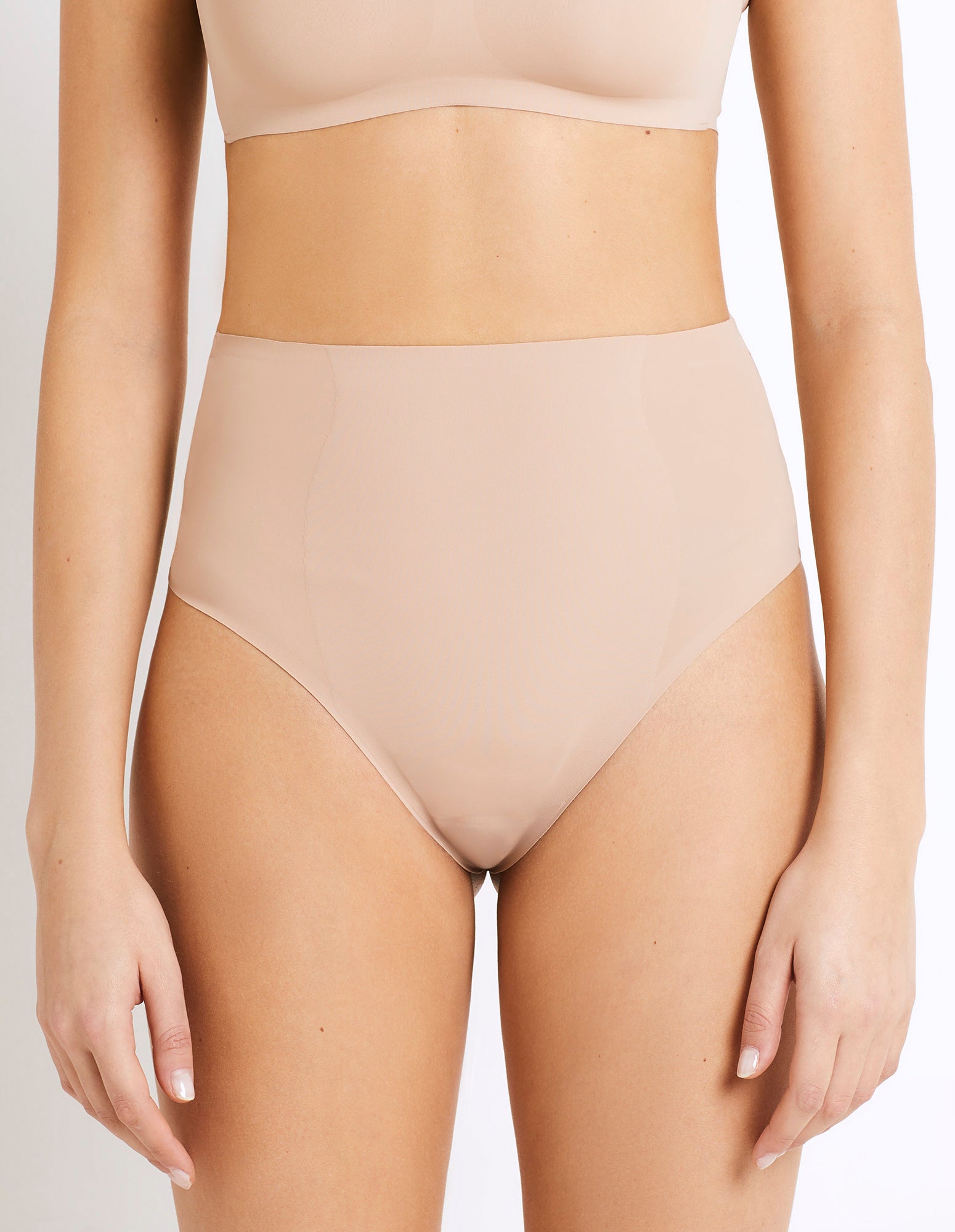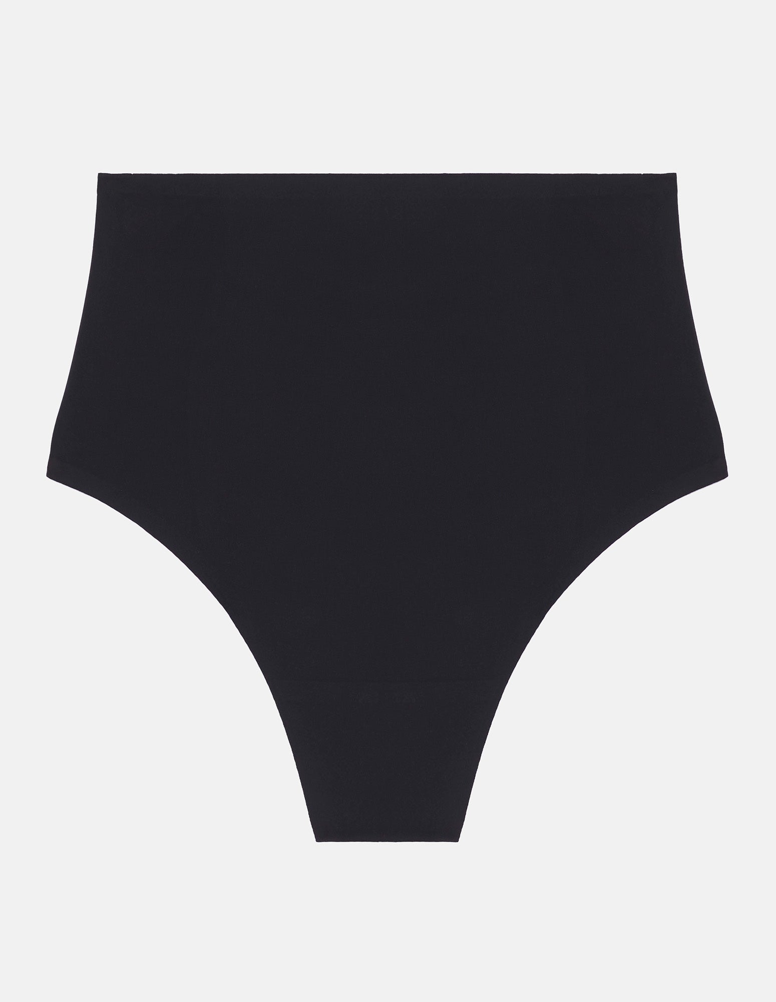 Superfine Shaping, a light shaping line made of comfortable fabric, without constraints. Garments made with recycled fibers, finished with laser-cut edges, seamless and elastic-free, with adhesive Bonding technology. The effect is invisible under any outfit. High-waist shaping thong brief with double-layered fabric for central front support.
