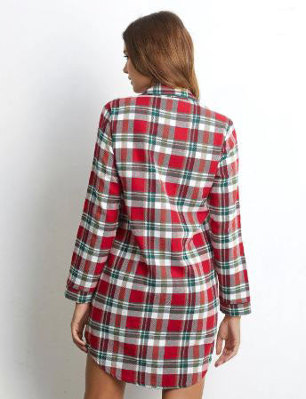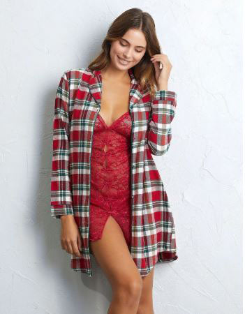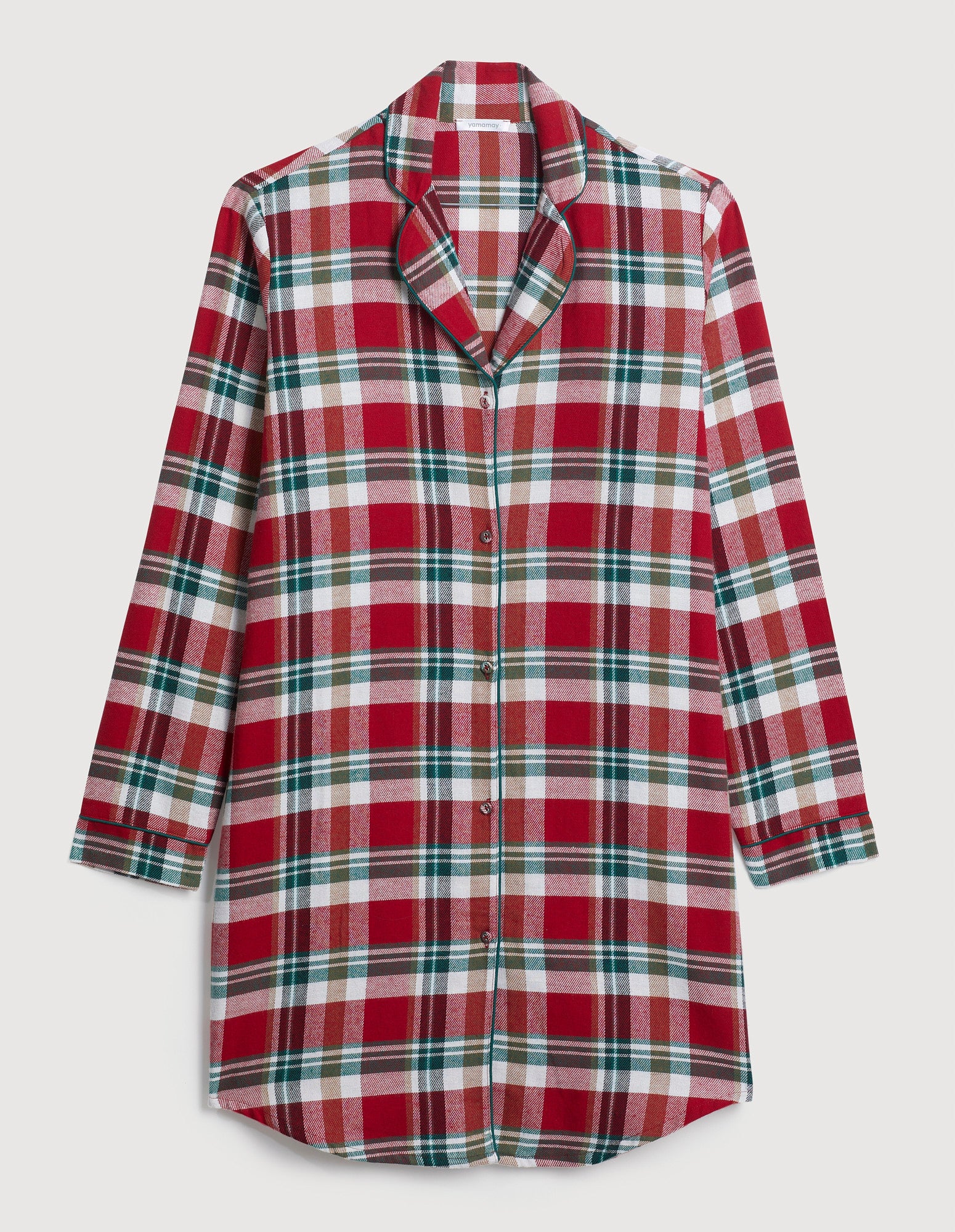Open nightgown made of delicate flannel. Timeless print in red and white tones. Long sleeve, collar and buttons tone on tone for a unique visual effect. Comfortable fit and wide cut. Perfect for winter nights.