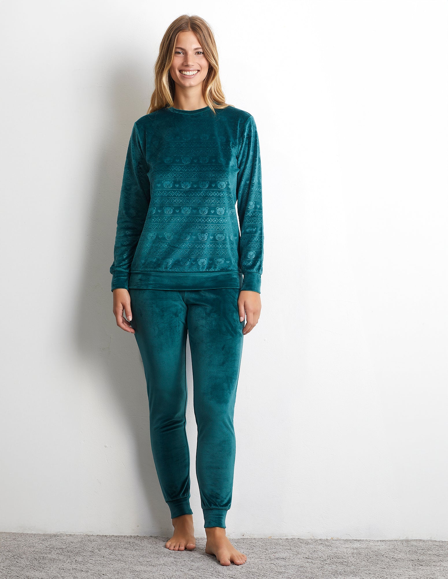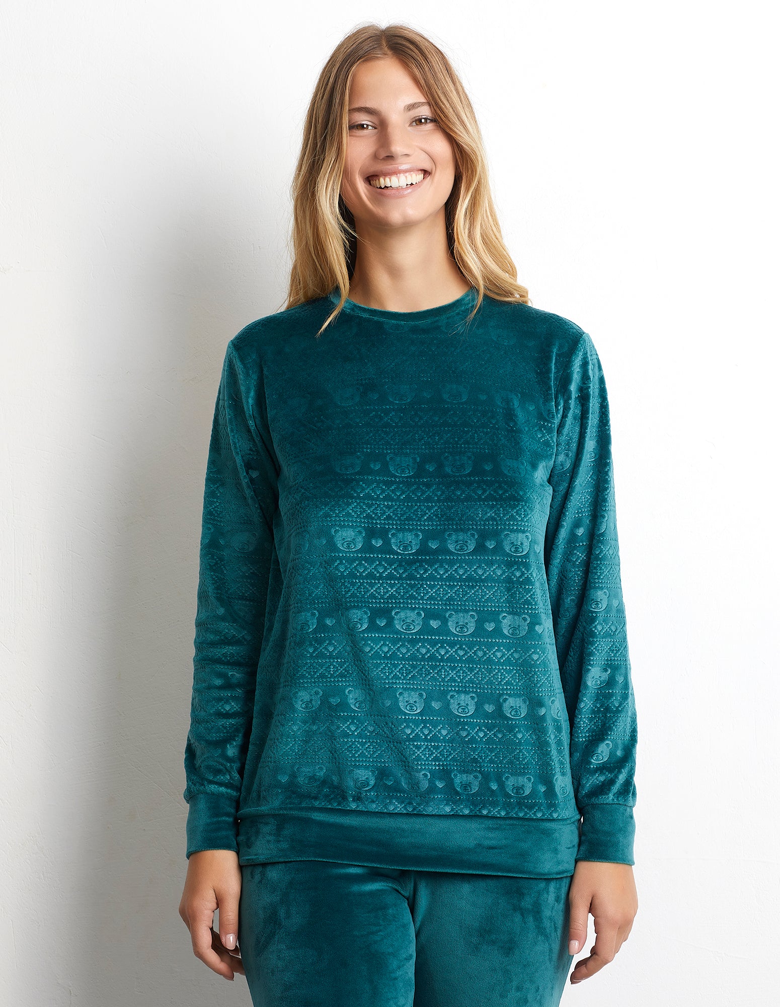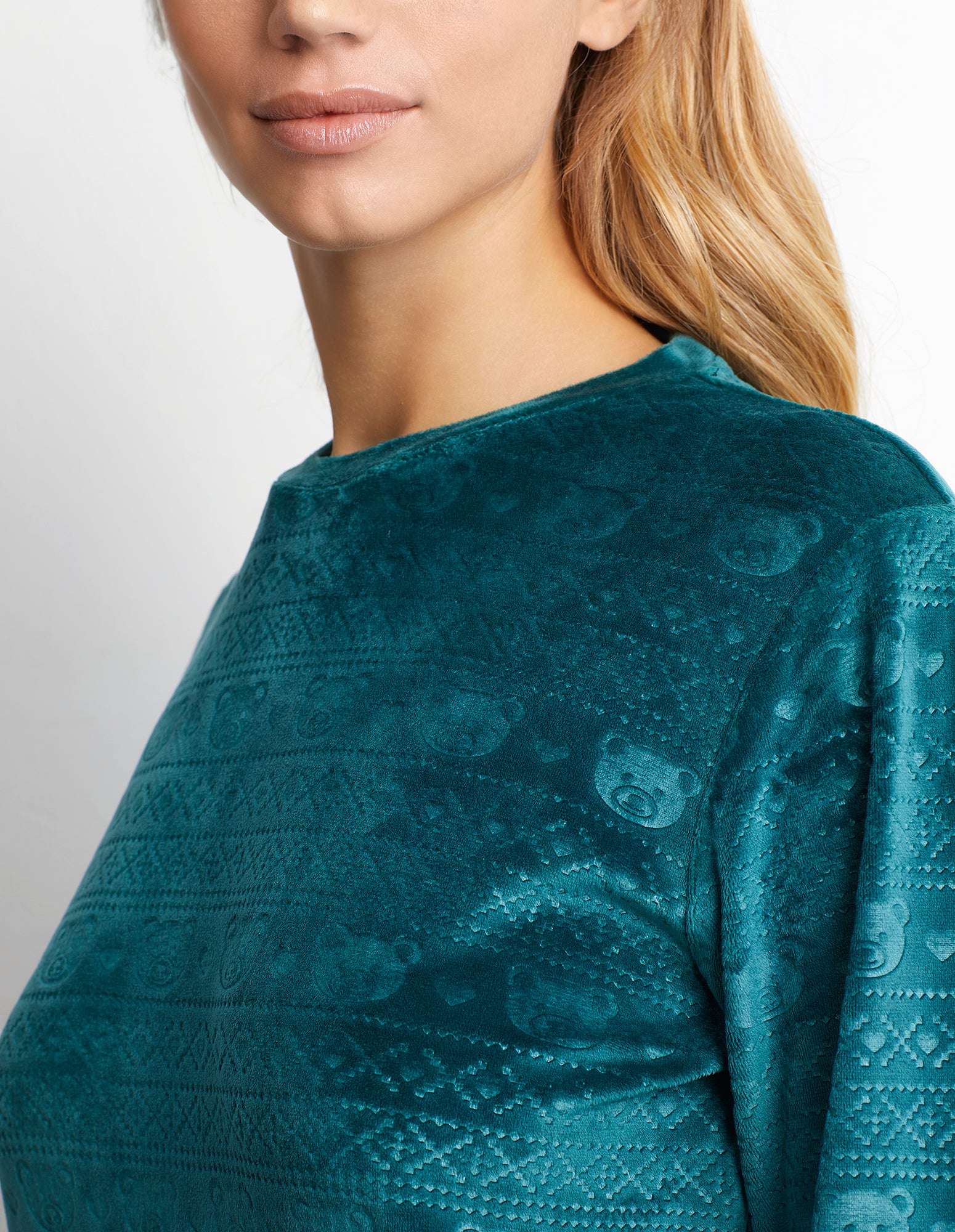 Long pyjamas in soft and warm chenille. The elegant and modern bottle green color is embellished with many small bears. Crew neck sweater with long sleeves. Long trousers with comfortable and practical elastic waistband. Classic cut and comfortable fit.