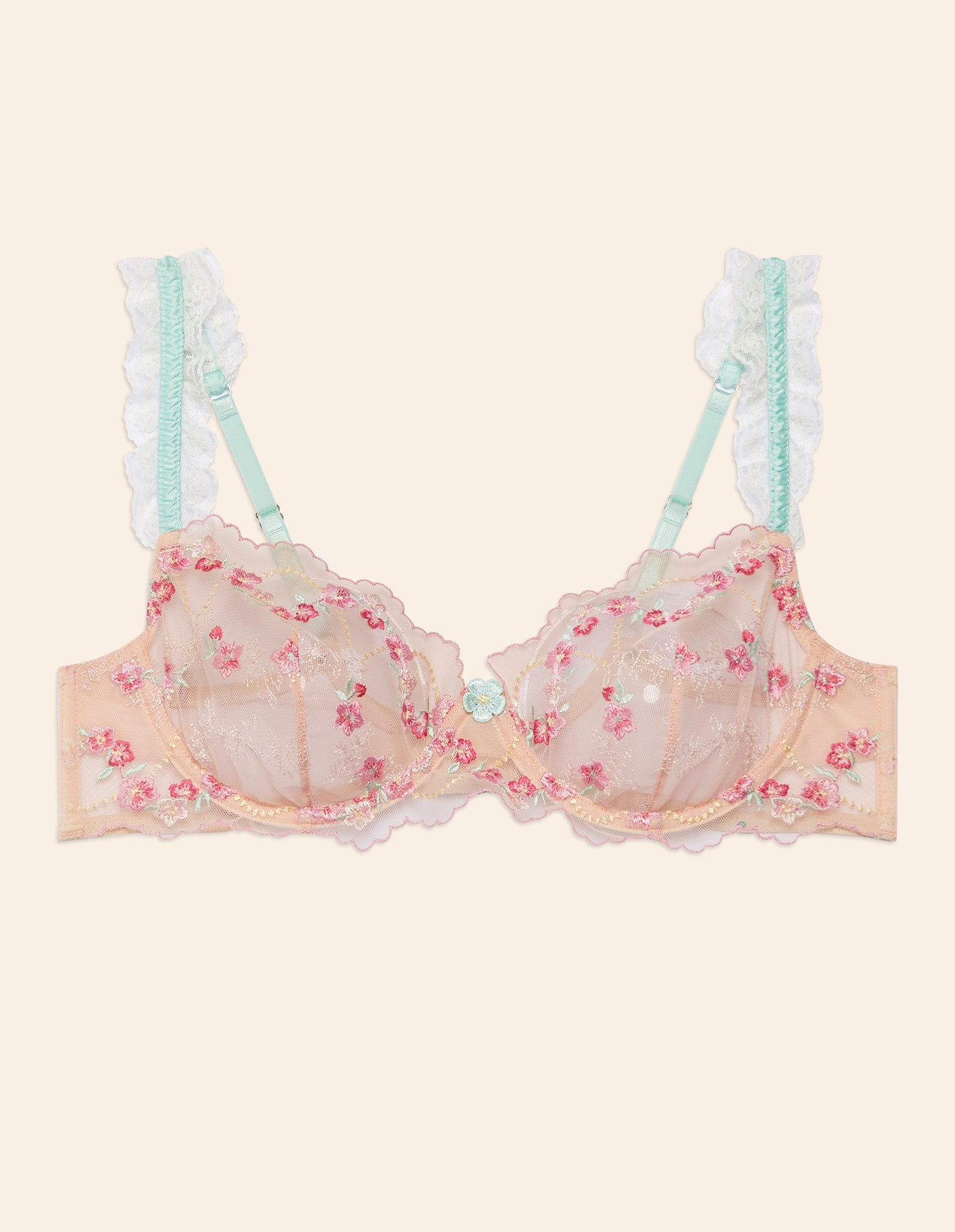 Unlined balconette bra with underwire, made of tulle and lace with floral embroidery in pink tones and differentiated cups. The Melissa balconette features light blue straps with white ruffles, adjustable.