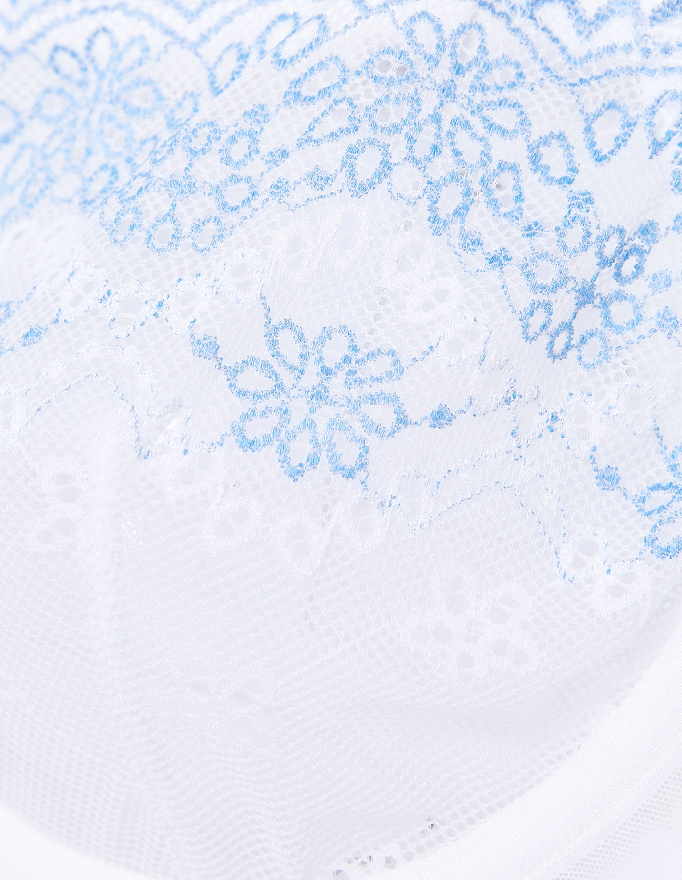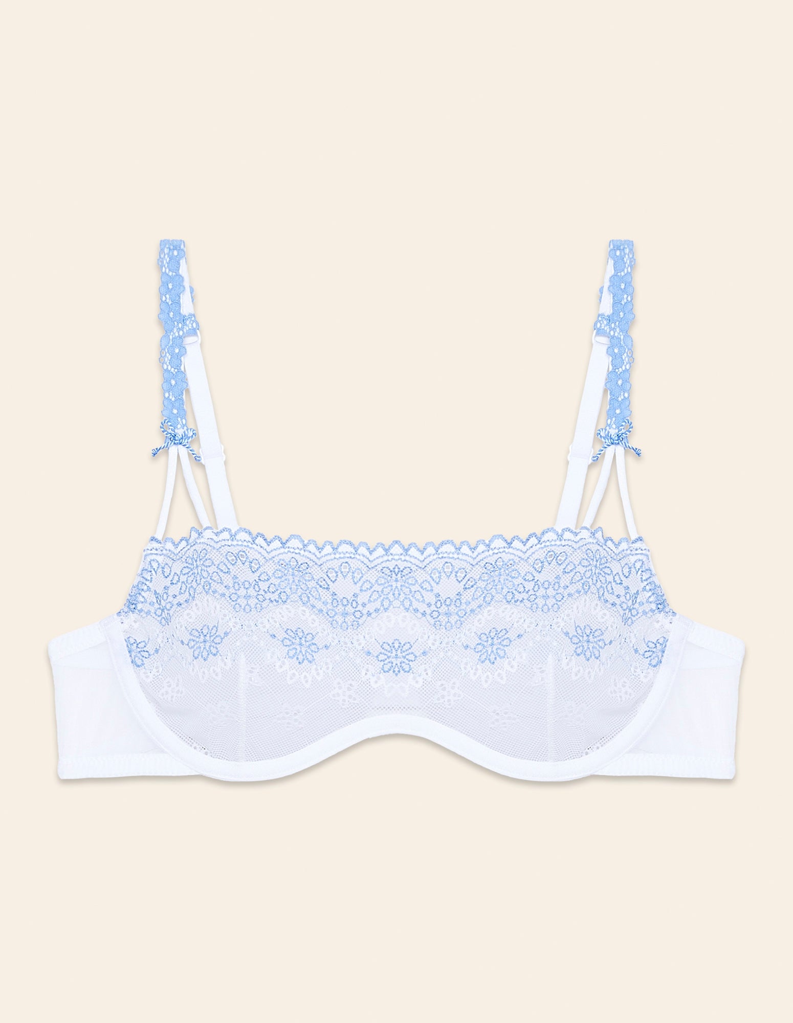 White underwired, unpadded bustier with light blue embroidered lace, enhanced with small blue floral accents at the center. Thin adjustable straps are decorated with blue floral lace details. The back closure is made with comfortable hooks.