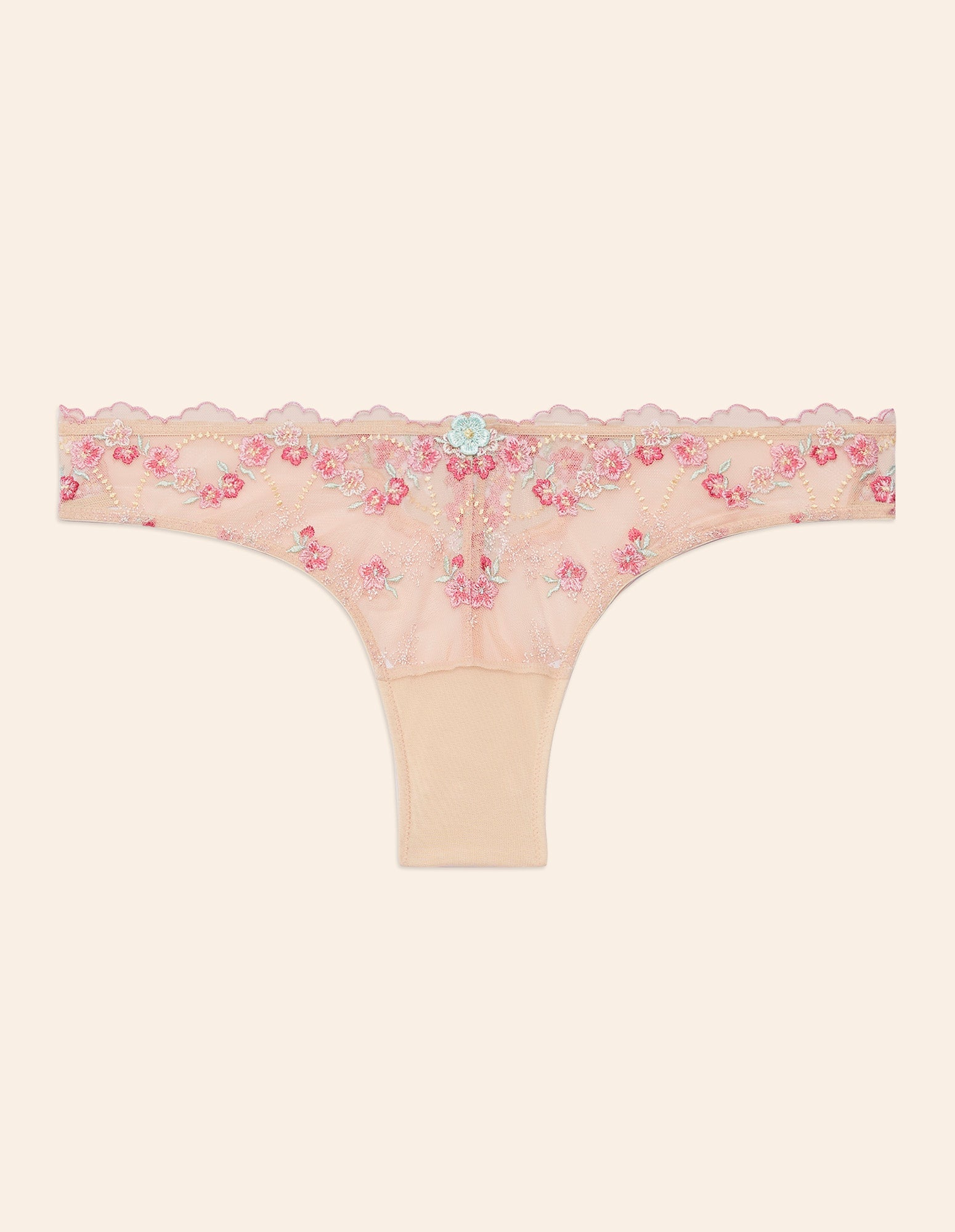 Brazilian briefs in tulle and lace with floral embroidery in pink tones, with a cotton gusset.
