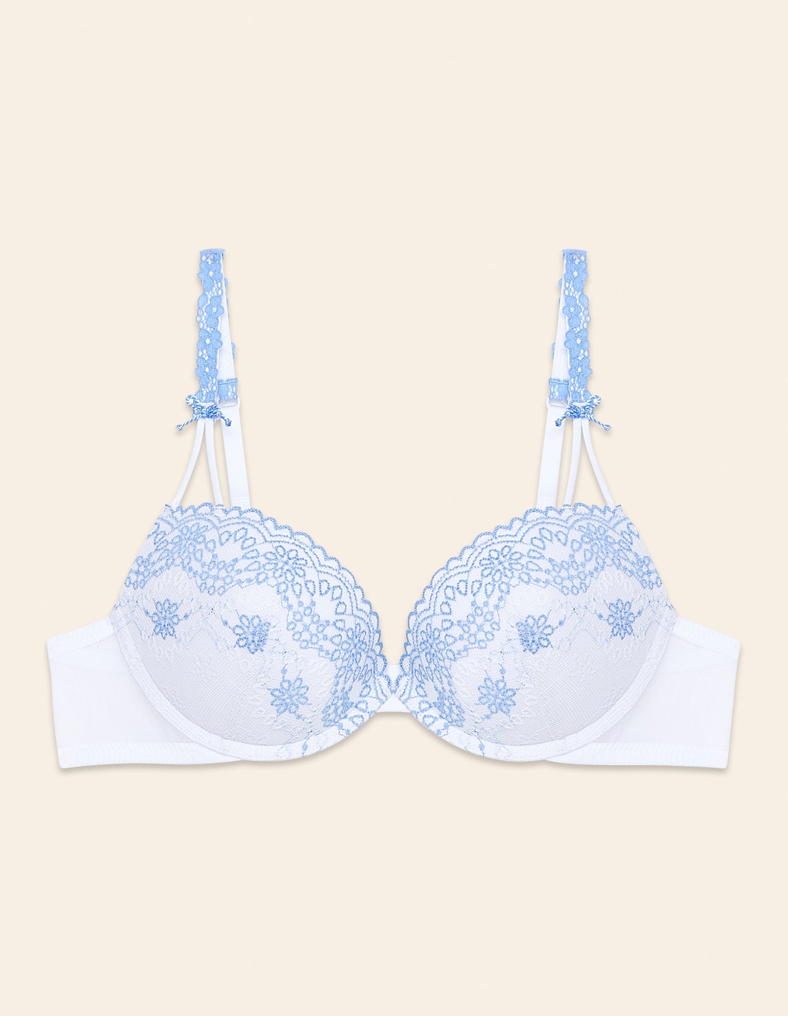 Push-up bra with underwire, made of light blue embroidered lace and thin adjustable straps with indigo floral lace details.