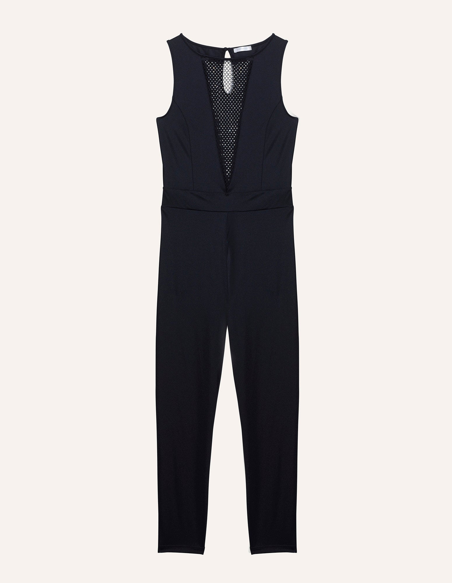Overalls with wide straps in elegant shiny charmeuse. Plunging V-neck on the décolleté made even more sensual by the detail of the all-over glitter mesh. Convenient back button for easy wear. Comfortable and snug fit.