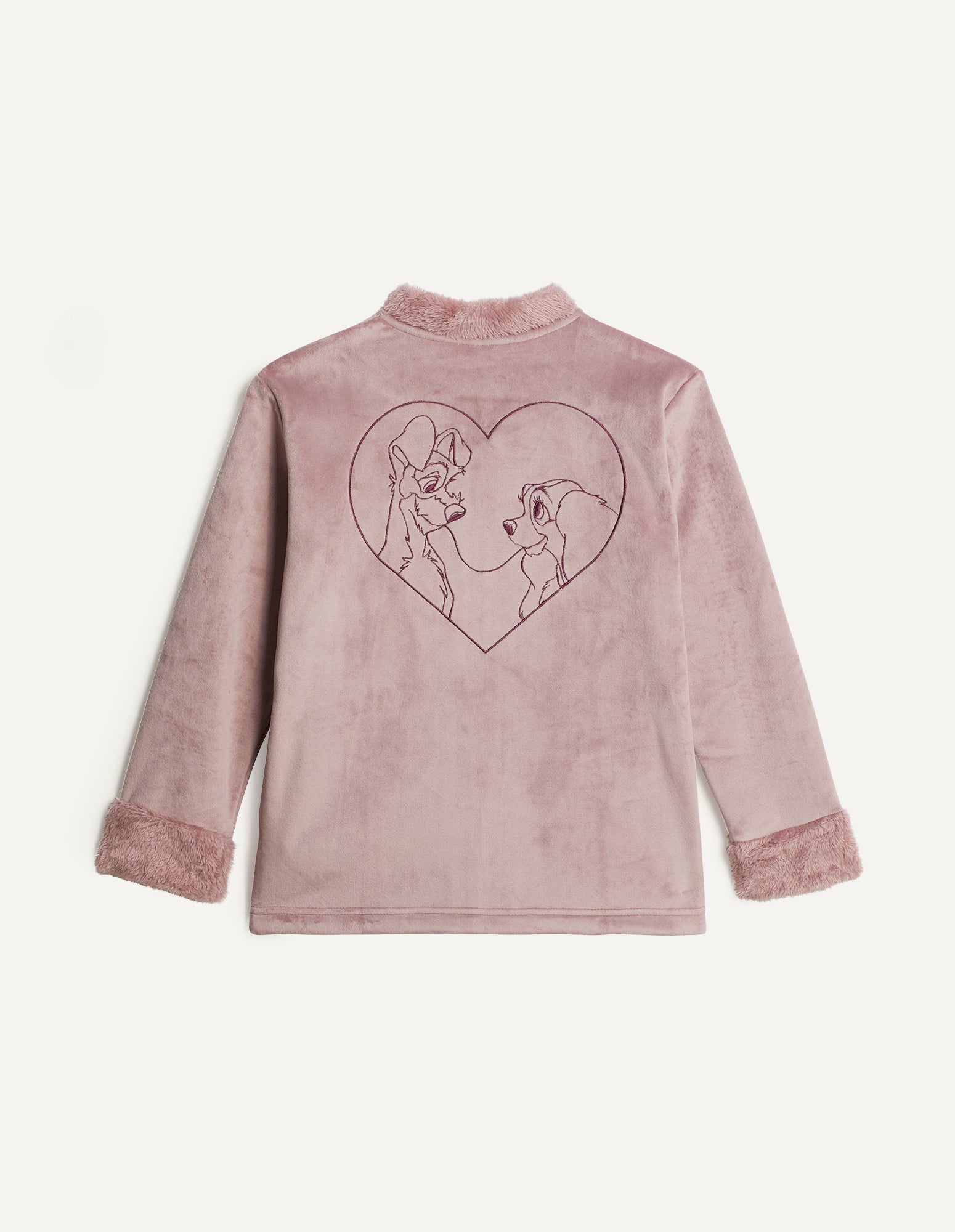 Discover comfort and elegance with our home sweatshirt inspired by "Lady and the Tramp". Made with a soft and warm fabric, in an elegant pink clay color, this sweatshirt is embellished with a high neck, a practical central zip and large side pockets. A garment that will add a romantic touch to your relaxing evenings. On the back a sweet illustration of Lady and the Tramp inside a heart, perfect for celebrating love. Chill out in style and create a sensational mother-daughter look by matching it with the adult model.