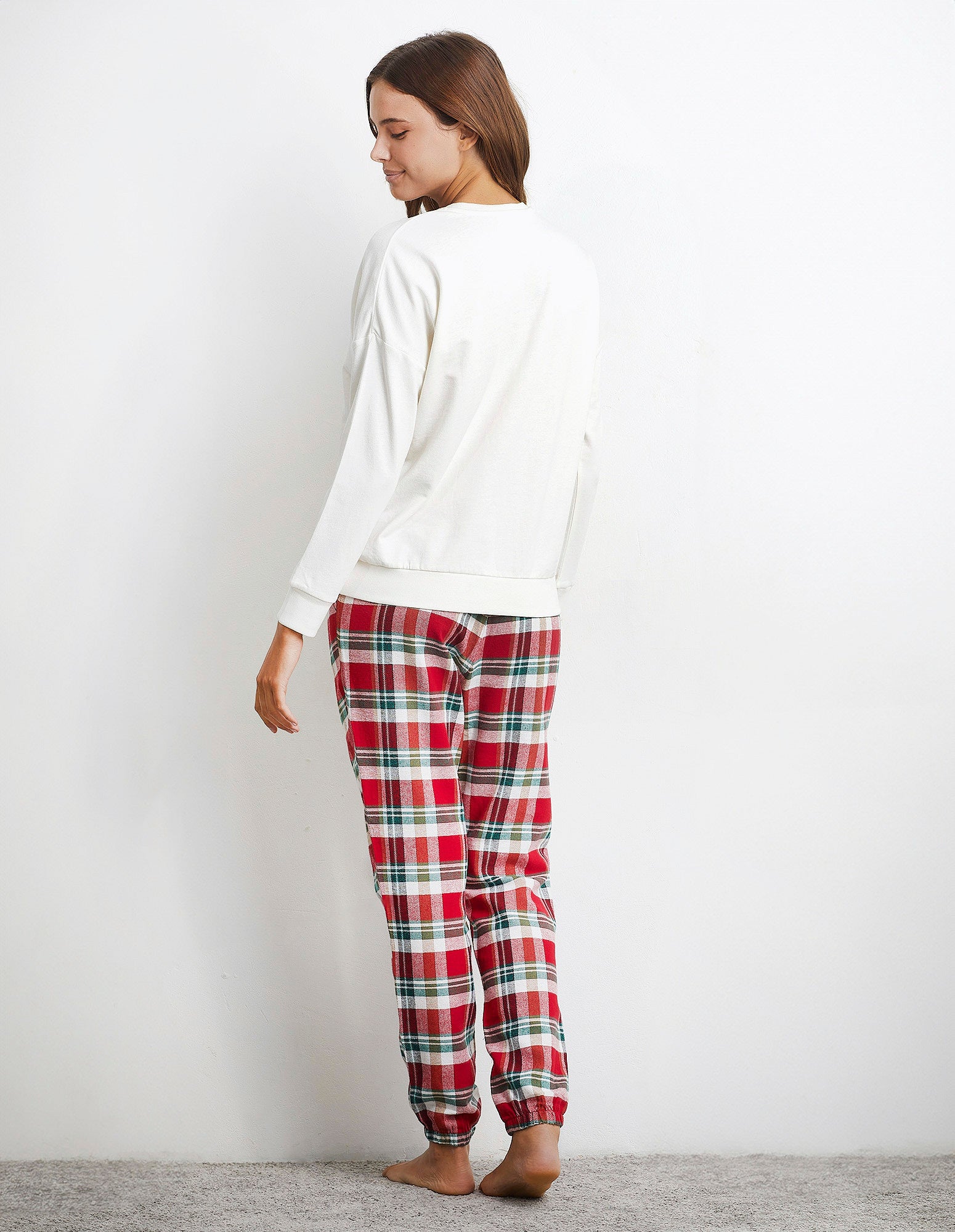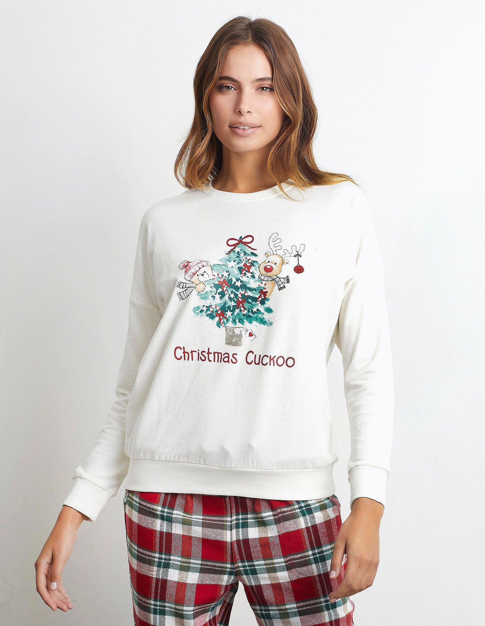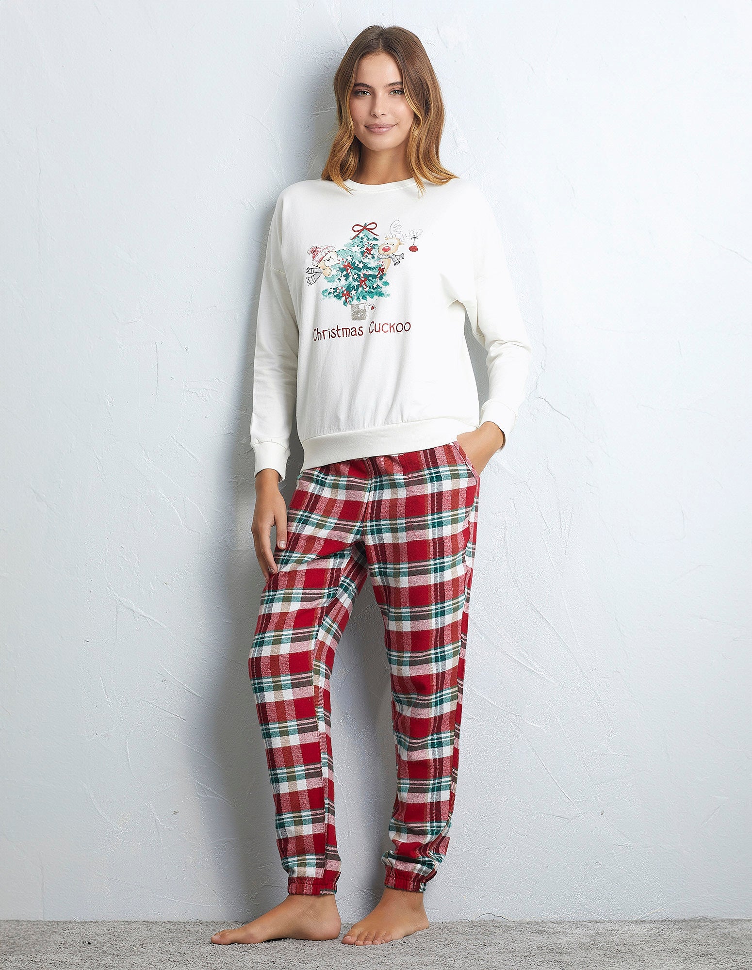 Long pajamas in soft and warm brushed French Terry. Almond-colored shirt with a crew neck, cuffs on the sleeves, and a Christmas-themed print. Plaid pants with a drawstring waist, side pockets, and elastic cuffs.